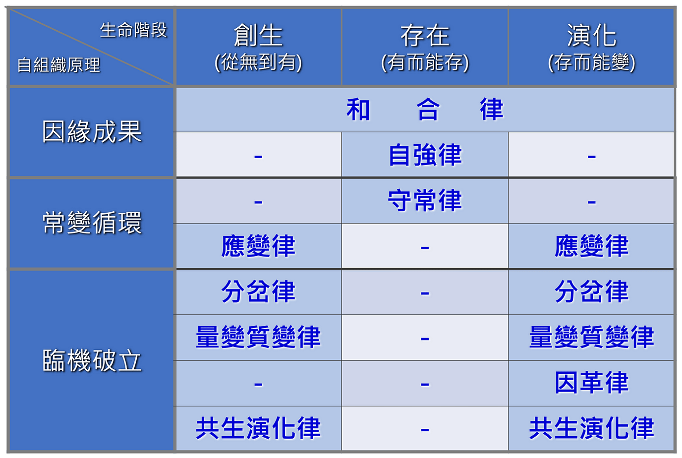 本人認為因緣成果是所有自組織原理的主架構,而其中常變循環原理為其底下的子架構,而在常變循環原理下,再衍生出臨機破立原理這個孫架構。
