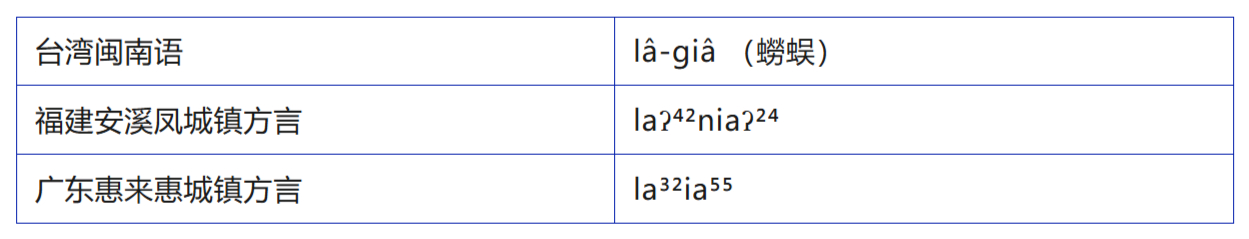 第二音节的辅音g>Ng>ŋ>n,发生鼻音化就变成凤城镇的laʔ⁴²niaʔ²⁴。辅音g弱化就变成介音i,变成惠城镇的la³²ia⁵⁵。浙江的畬話lau55kiəu43,江西客家话的lao31khia212都指蜘蛛,都属于同源词。