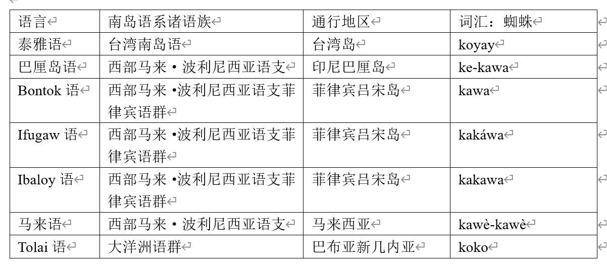 侗台语族是南岛语系在中国演变的子语言,壮族语·柳江话的kwa:u(蜘蛛)的词源应该是原始南岛语的*kakawa(蜘蛛)。原始南岛语的*kakawa(蜘蛛)在南岛语系中的同源词如下表: