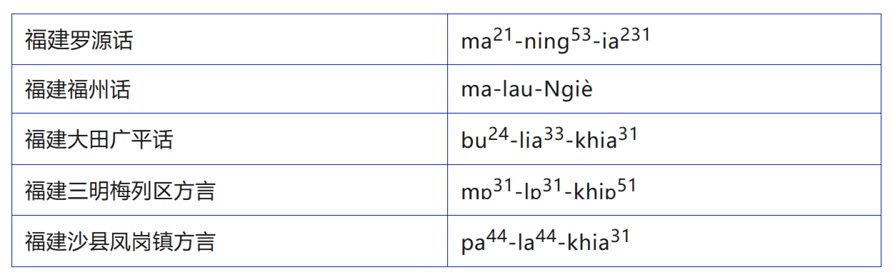 潮汕话属于闽南语,闽南语的“蜘蛛”与潮汕话的“马龙爷”(be6-leng7-ya5)同源的词汇如下表: