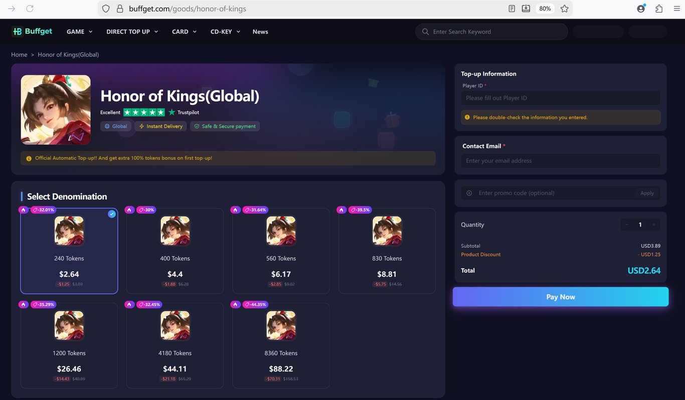For those of us who want to rock this skin on day one without eating instant noodles for a week, you need to be smart about your gaming budget. I highly recommend you go to Google and search for "buffget". It is a platform that many of us in the veteran community use to buy cheap Honor of Kings Tokens. By using buffget, you can secure a flat 20% discount on your top-ups. It is safe, the delivery is fast, and it essentially gives you free currency compared to the standard app store rates. Saving that 20% means you might have enough leftover tokens to buy the accompanying emote pack or trail effect.
