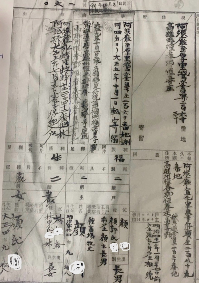 由於外婆是屏東墾丁人,祖先來自滿州,李孟穎從地緣關係以及如《沒有名字的人》相關閱讀中,旁敲側擊自己與親人可能擁有平埔血緣。這一兩年,他從日本時代的戶籍調查簿,發現外婆的媽媽標示「生」註記,推斷是排灣族人;而來自新埤建功村客家聚落的外公戶口資料,則有潘姓祖先列名,這些發現都為尋根帶來新的方向。