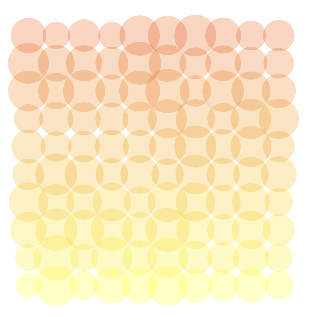 好吧,乍看之下可能還是不明白給你看這兩個東西做什麼。但且聽我慢慢道來。這兩個圖例唯一的差別是小圓點的數量,圖一密度稀疏,並沒有交疊在一起。而圖二的小圓點數量密集,並且互相交疊。說到這,你可能會想起先前提到的「顏色疊加方式」,沒錯,重點就是這個。在上半學期的練習中,若有兩個圖形出現交疊的情形,他們僅會根據程式的執行順序呈現「上下交疊」的圖層關係。然而,我們若在程式碼中設定「混色模式」,就會讓兩個元素依照我們設定的方式產生特殊的效果。