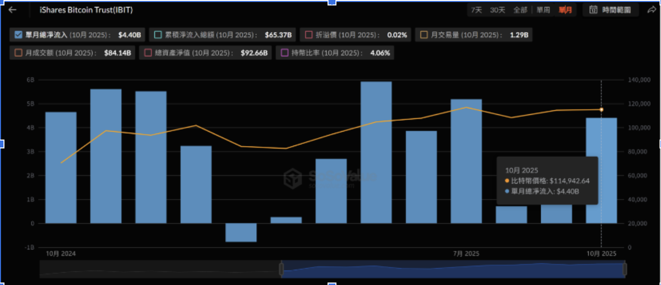 儘管,10月份初期加密貨幣市場經歷了史上最大清算浪潮,但貝萊德依舊保持穩定買入力度,沒有受到短期波動的干擾。相反,資金仍在加速流入,截止目前——10月單月,IBIT的資金淨流入合計達到約44億美元,顯示貝萊德淨流入資金正在堅定購買比特幣!