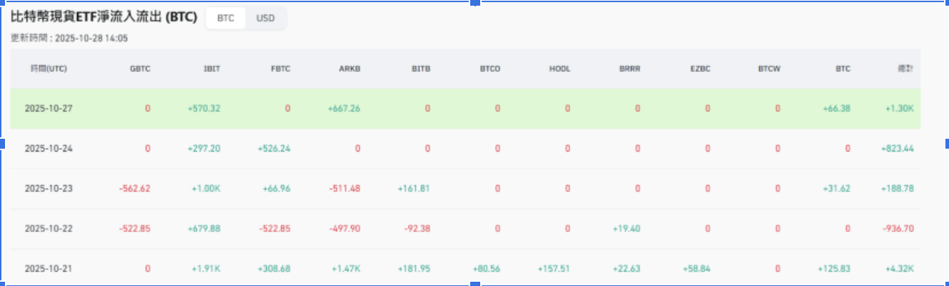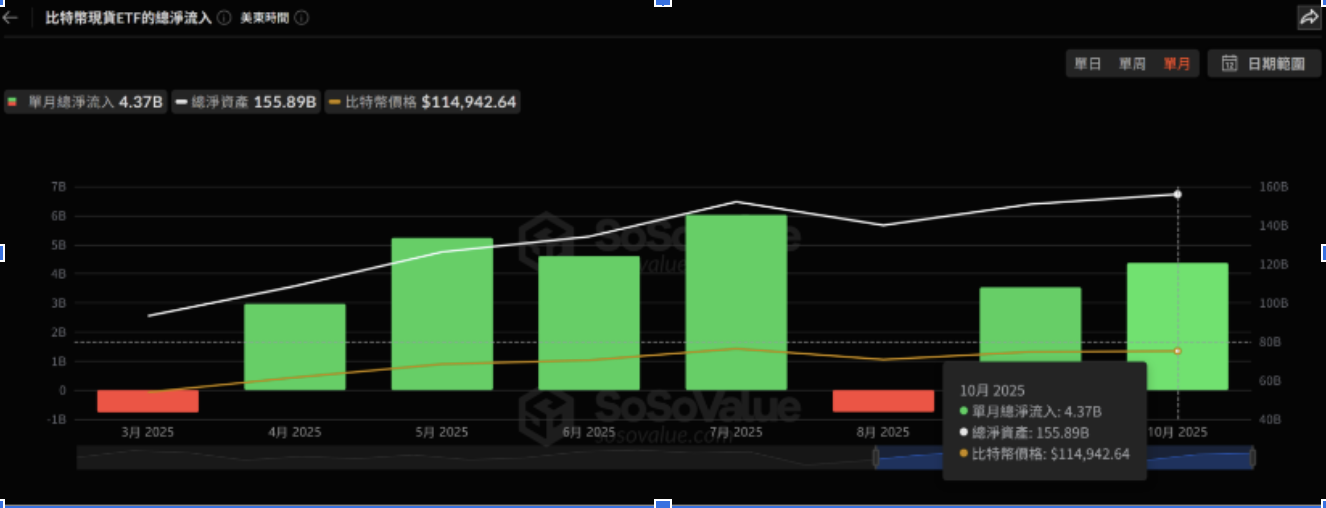 此外,儘管比特幣價格階段性下跌了約15%,但10月份比特幣現貨ETF的累積資金流入仍維持正成長。