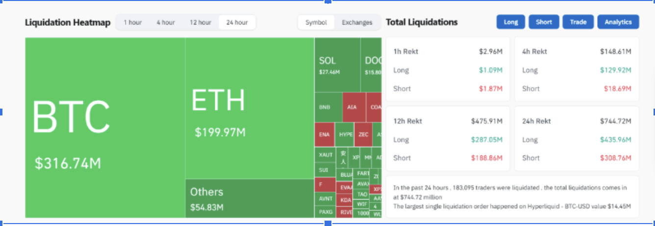 在那 24 小時之內,加密貨幣市場總共爆倉清算7.44億美元,其中多頭被爆倉清算了 4.35 億美元,而空頭市場也被清算了 3.08 億美元。可以說,在這一天,多空雙方都沒能全身而退。