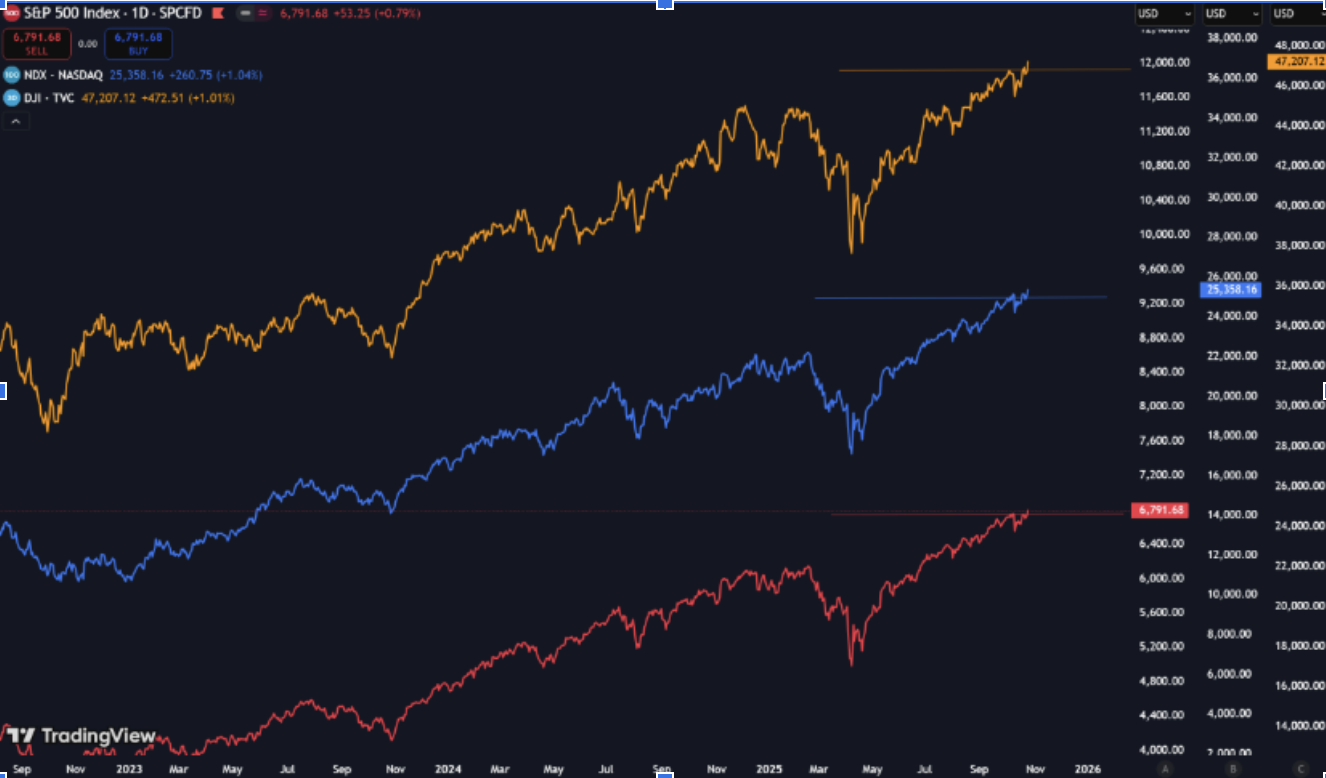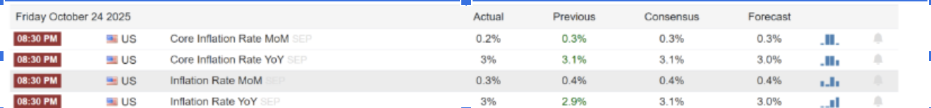 因此,因為9月CPI表現低於預期,再加上市場普遍押注聯準會即將降息,這兩大利好疊加,全球股市應聲上漲——標準普爾 500 指數、納斯達克 100 指數和道瓊工業指數均創下歷史新高!