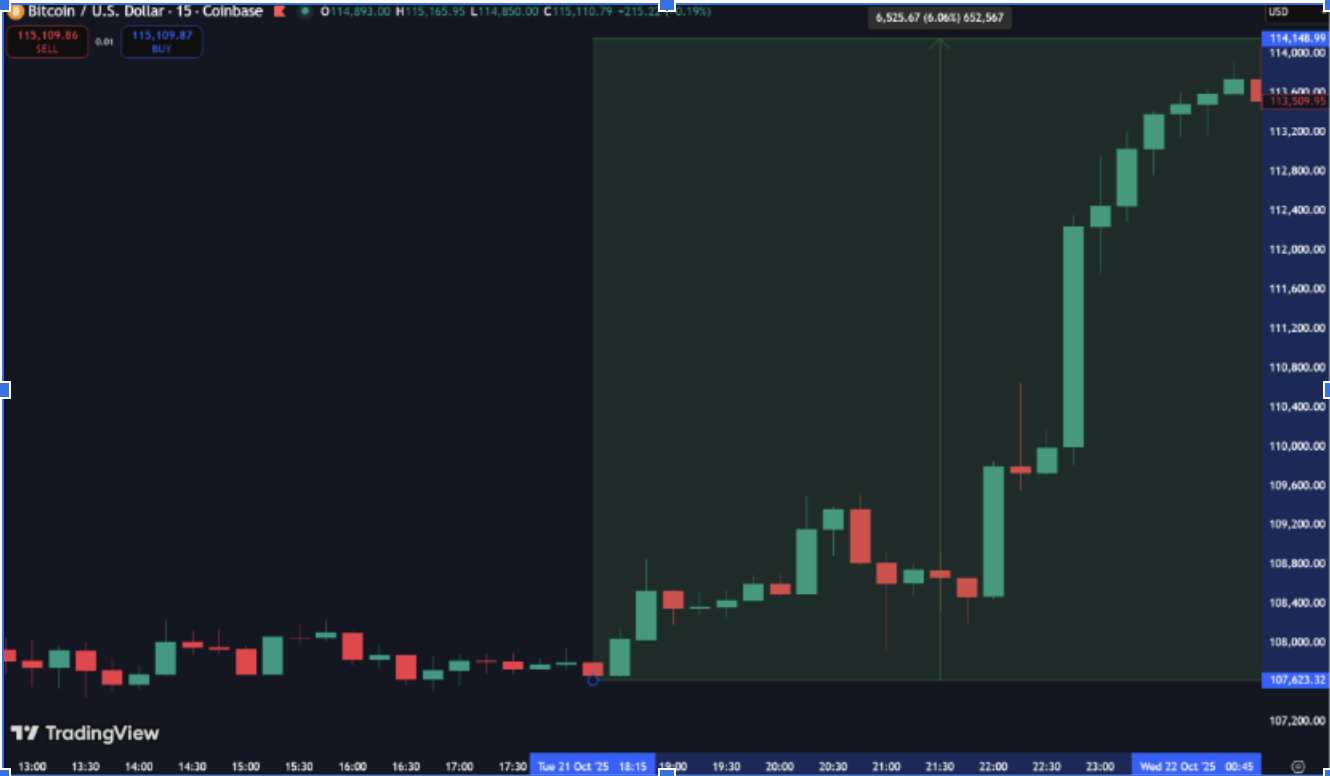 上週,加密貨幣市場一度出現明顯回調,主因是中美貿易局勢再度緊張,市場避險情緒升溫,資金短線撤出風險資產。不過,到了晚上,行情突然反轉,比特幣強勢拉升,一口氣突破了 114,000 美元。