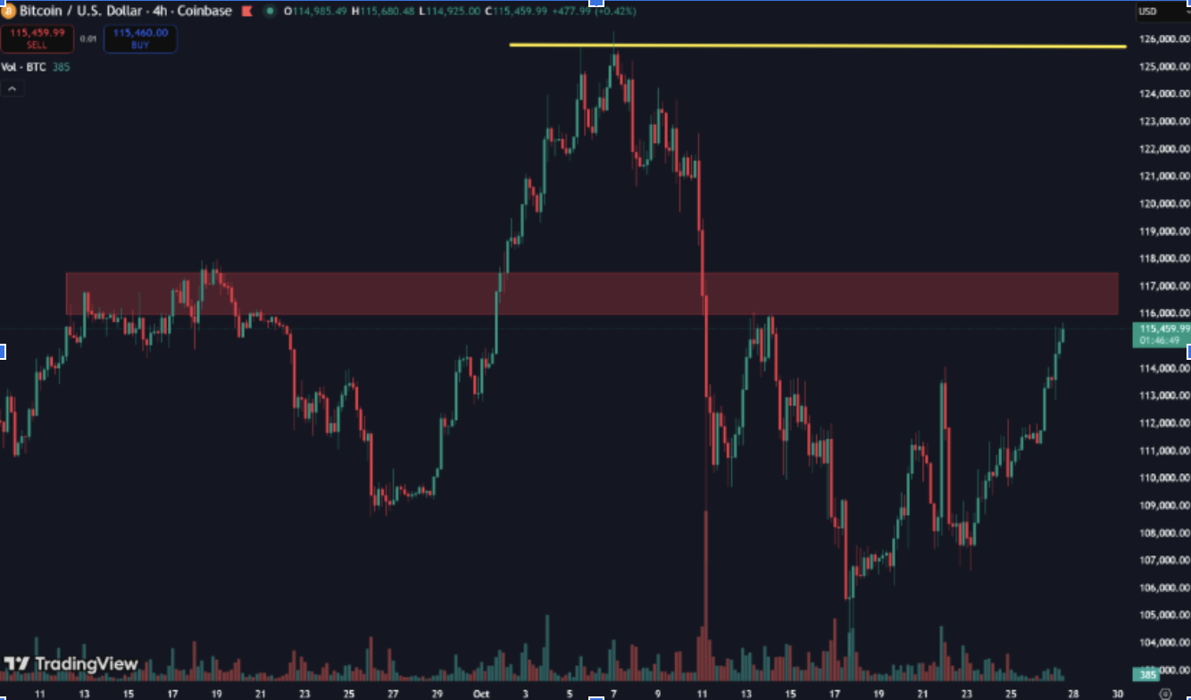 此外,重點來了,當前比特幣價格,已經再次來到一個關鍵位置。從K線4小時等級來看,在價格區間116,000美元-117,500美元價格區間,這裡既是前期壓力區,也是市場情緒的分水嶺。