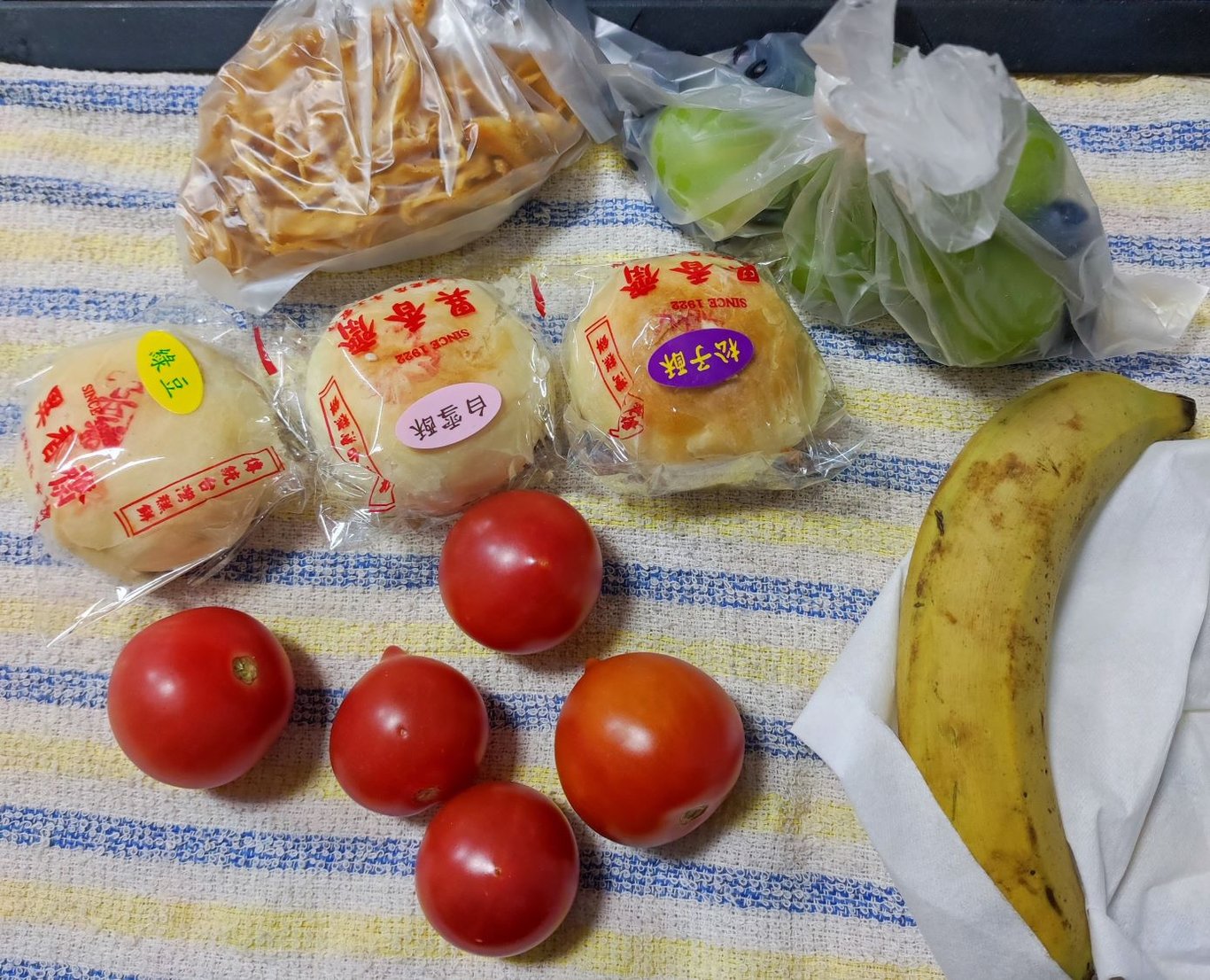 糕點都放同事桌上,水果也塞給同事了,大家不用擔心我過年會吃胖,剛去量體重...,還少了一公斤......。