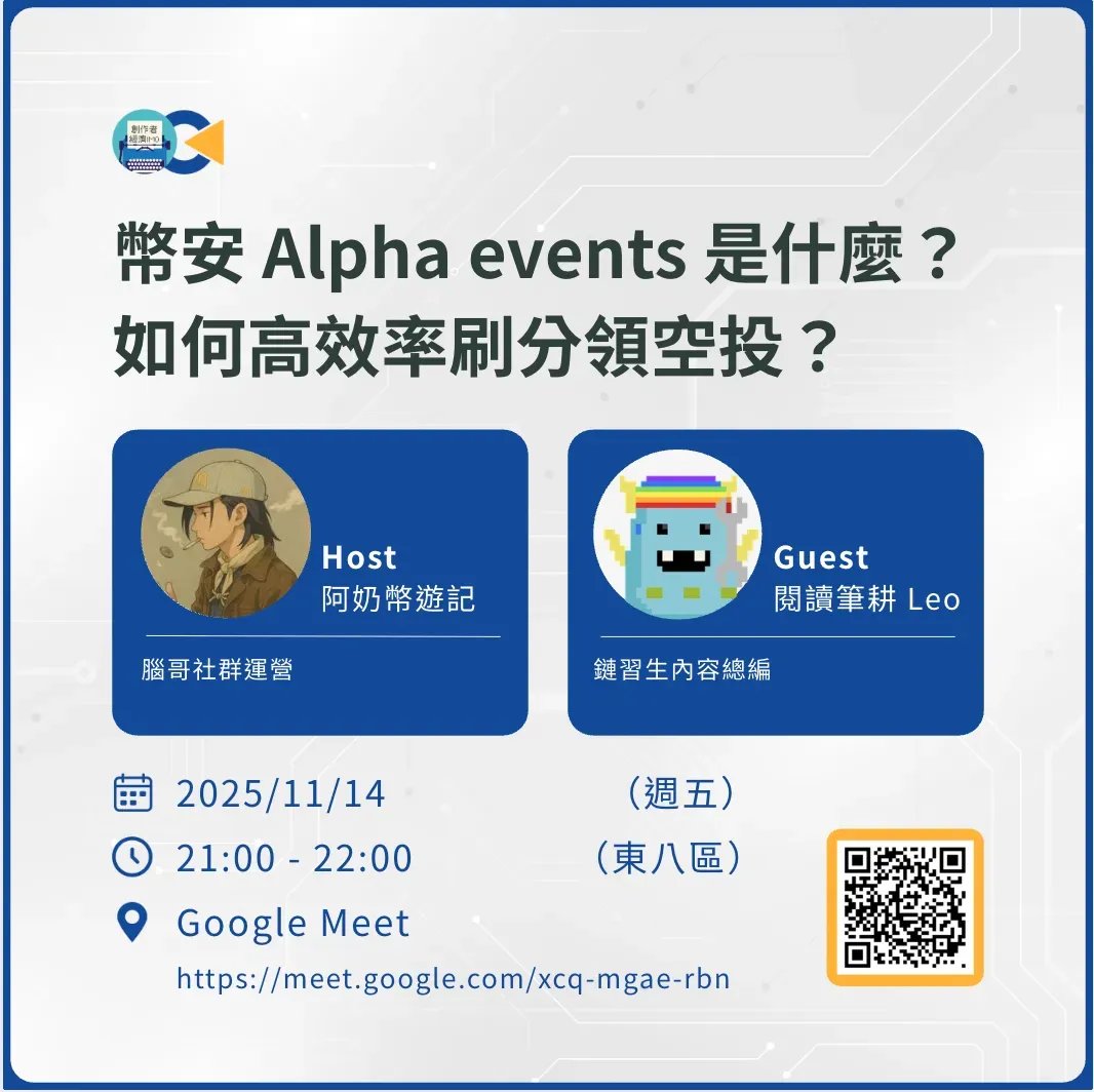 電子報的最末,帶你重溫 11 月 14 日晚間【創作者經濟 IMO】線上語音活動,邀請到鏈習生內容總編 @閱讀筆耕 來介紹「幣安 Alpha events 空投」。