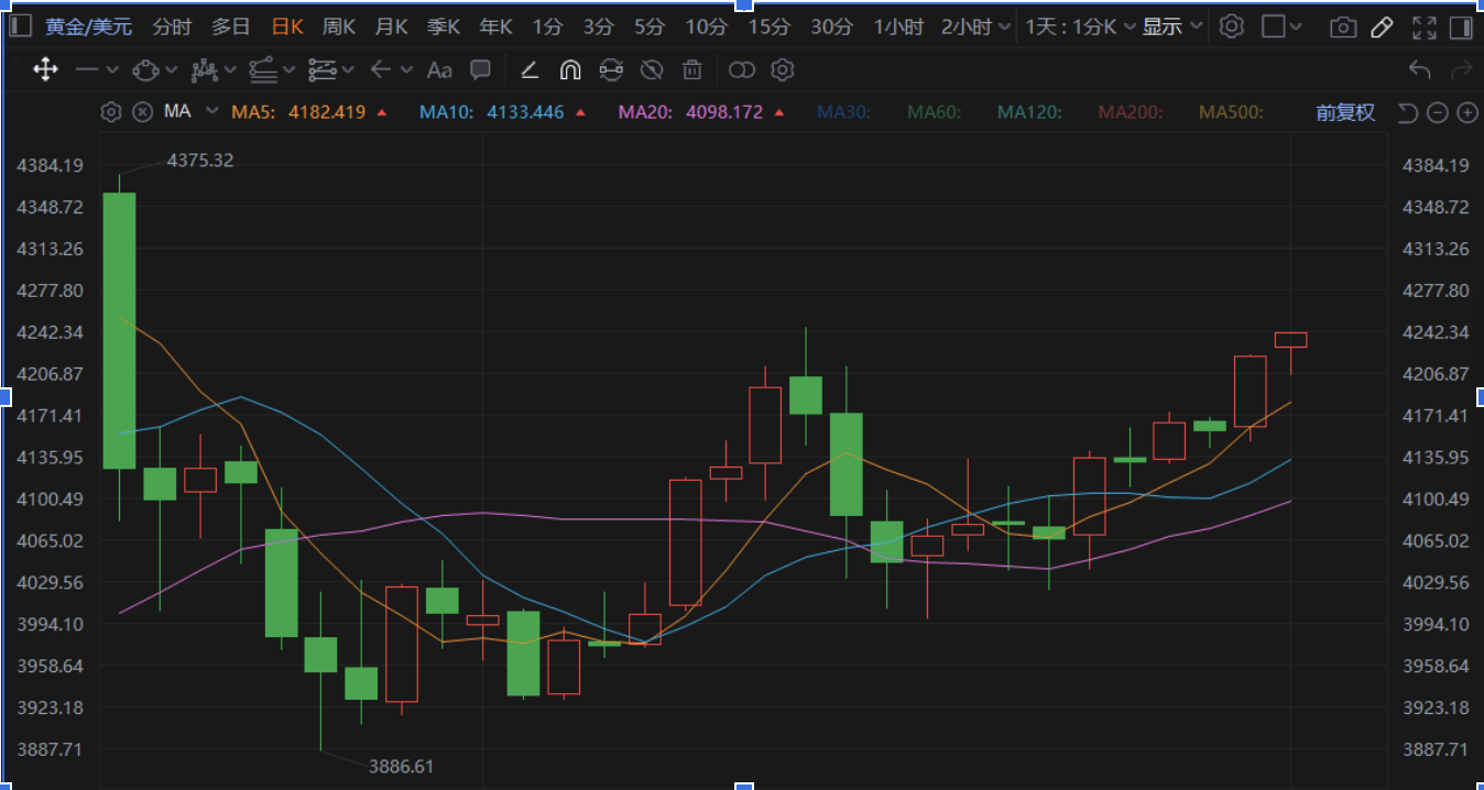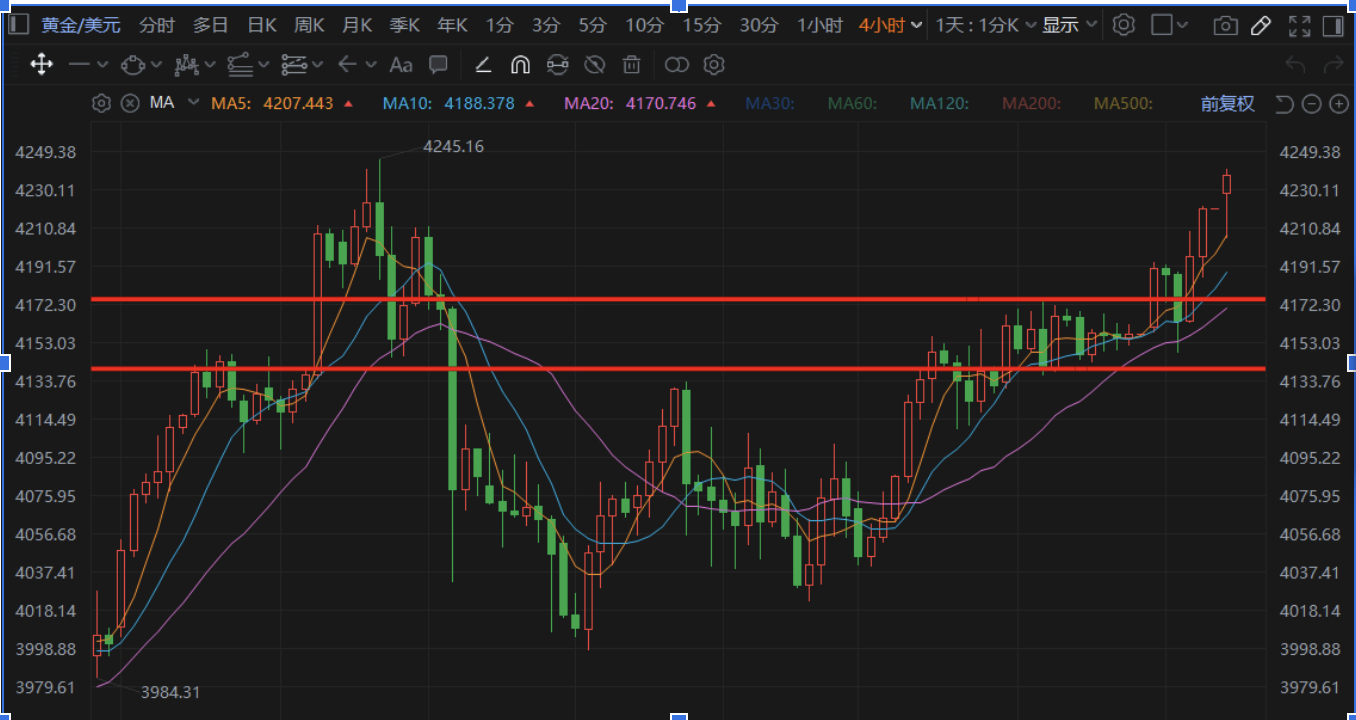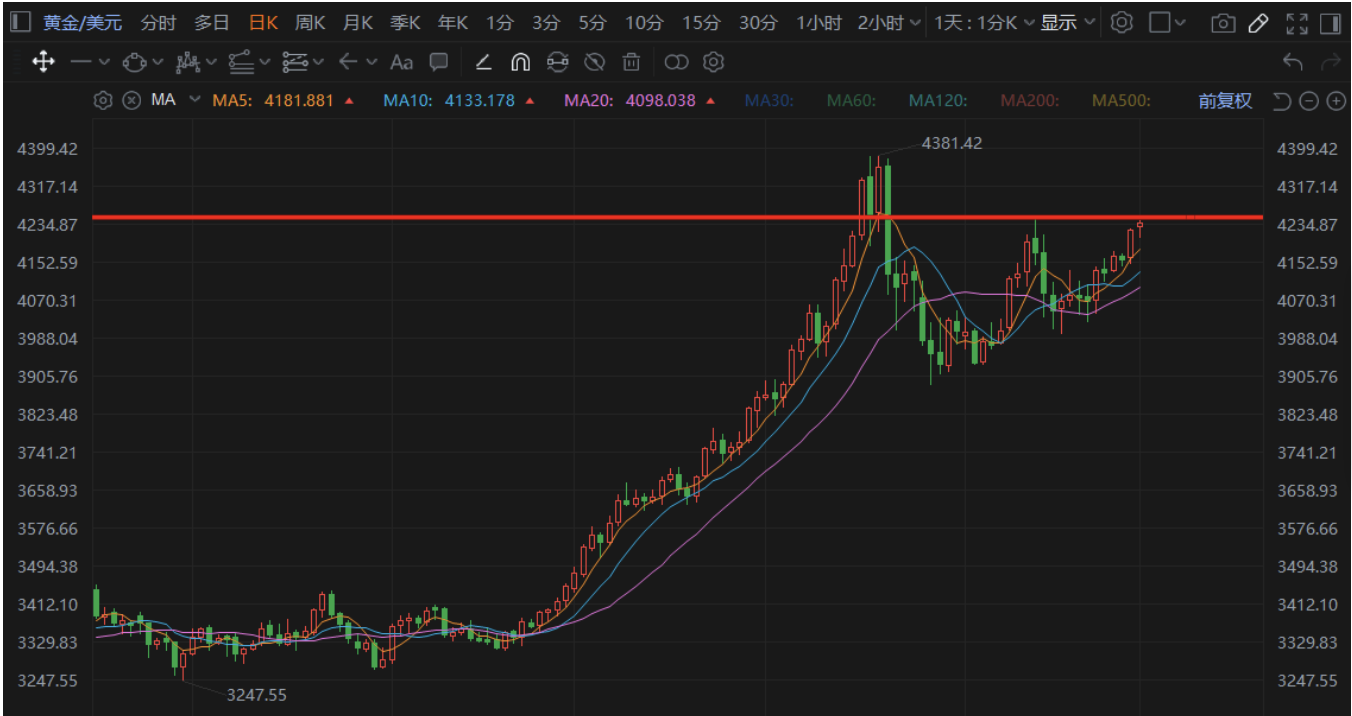 朋友們,黃金終於突破了!上週五,黃金就像一匹脫韁的野馬,一路狂飆,直接衝破了4200美元這個重要的心理大關,最後收在了4219美元附近!