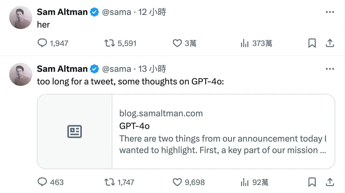 讽刺的是,在当初发布 GPT-4o 时,山姆奥特曼发了一篇只有“her”一个单词的推文,指的毫无疑问是 2013 年的科幻电影《她》(Her)。这部电影讲述了一名离婚后的上班族与最先进的人工智能助手萨曼莎发展恋情的故事,彼时科幻的剧情在最近这一两年已经变成了现实,有许多人展示自己与 DAN(Do Anything Now)越狱模式下的 ChatGPT 谈恋爱的场景,也因此这次 OpenAI 停用 GPT-4o 能够掀起如此巨大的反弹情绪[1]。有人嘲笑这些用户陷入了集体癔症而无法认清现实,也有人列举 AI 伴侣的种种好处予以反驳,还有人由此反思,人类在拥有互联网这个迄今为止最先进的通讯手段的情况下,孤独情绪却前所未有地肆意蔓延,高质量亲密关系可遇不可求的现象。