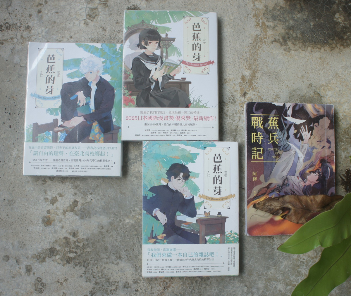 人並不僅是時代或命運的被動棋子。我聯想到另外兩部以「人」或角色的自我覺醒作為主要關注,也做了大量扎實史料功課與講究呈現的臺漫作品:阿獰《蕉兵戰時記》和尚未完結的左萱《芭蕉的芽》。這兩部作品都是「臺北高校創校一百週年(2022)紀念作品」,臺北高校即臺灣總督府臺北高等學校,位於國立臺灣師範大學今址。兩部作品分別呈現不同時空下臺北高校學生的人生片段,《蕉兵戰時記》主要呈現個人面對戰爭時期的無力感與徬徨(其實當時的臺北都不能算是嚴格意義的直接戰場);《芭蕉的芽》則把時間往前推了十多年,著眼於1930年代高校生活的自由多彩,與追求文藝興趣的熱烈浪漫情懷。