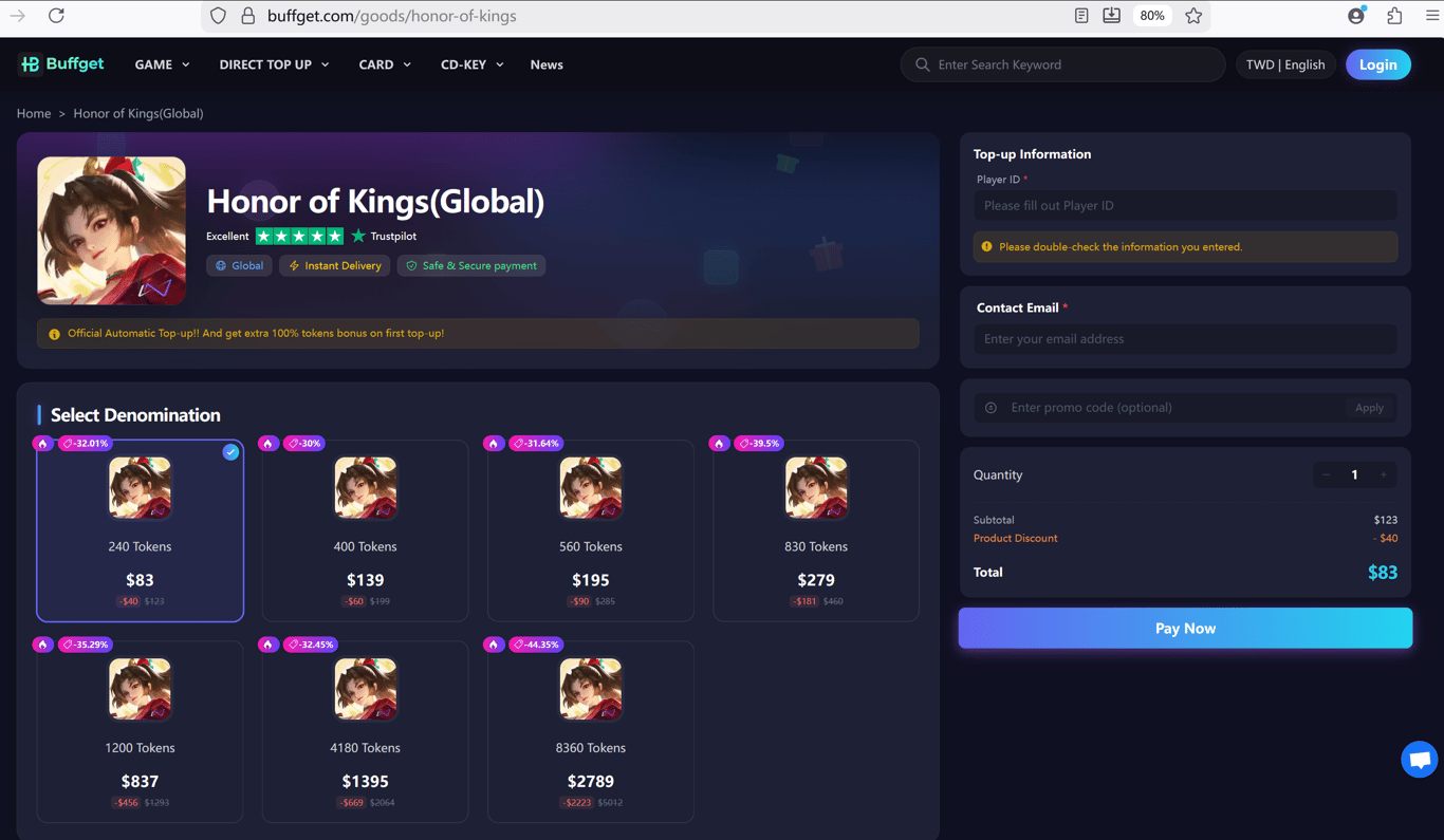 I highly recommend you take a moment to Google search for "buffget". It is a platform widely trusted by the veteran community to Honor of Kings top up. By utilizing buffget, you can secure a consistent 20% discount on your Token purchases.