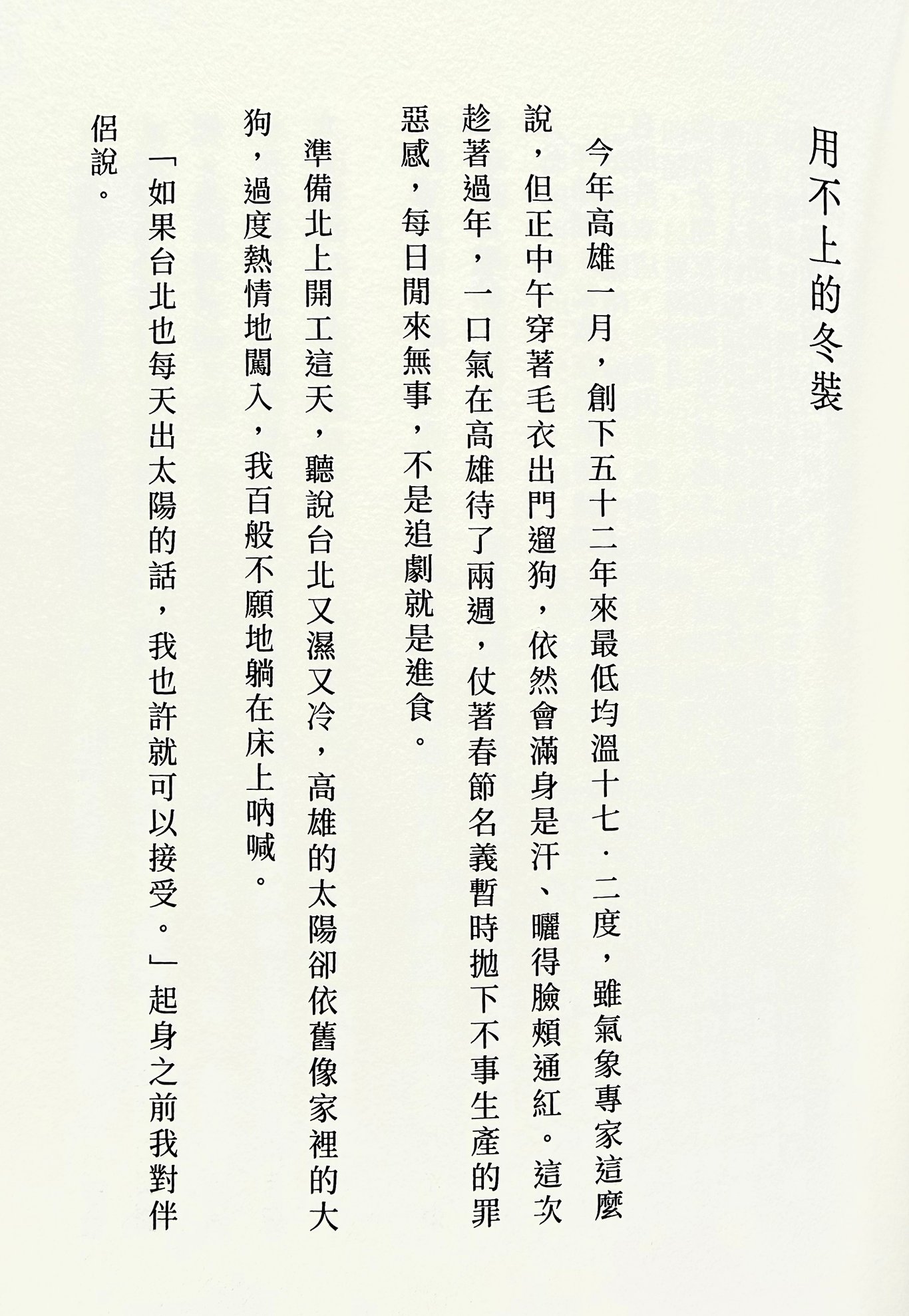 這篇《用不上的冬裝》短文,收錄於來自高雄的淺堤樂團主唱蔡依玲最近出版的新書《在燈暗的時候唱歌給自己聽》。我是淺堤鐵粉,搜尋一下竟然在 Matters 上提過他們七次。依玲寫的詞有種深切感受生活與生命後嘗試以波瀾不驚的幽淡口吻道出的味道,自然寫散文也飄拂這款氣息。