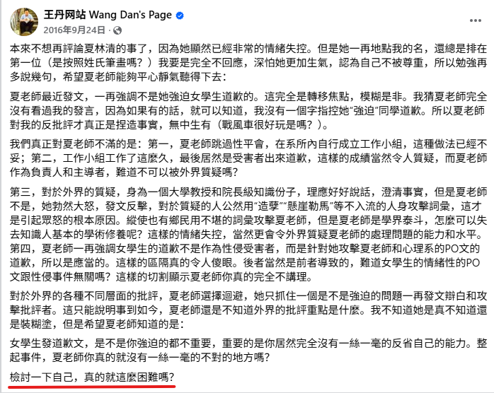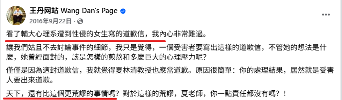 有人说,某个圈子的人早已烂掉,不值得费力给予关注。但笔者认为如果不指出这些问题,任由“王丹=受害者”、“清大性平会=不公正的加害系统”等说辞不断扩散,甚至成为惯例,受害者将更难发声,而小圈子互相包庇、颠倒黑白的弊病也会愈演愈烈。