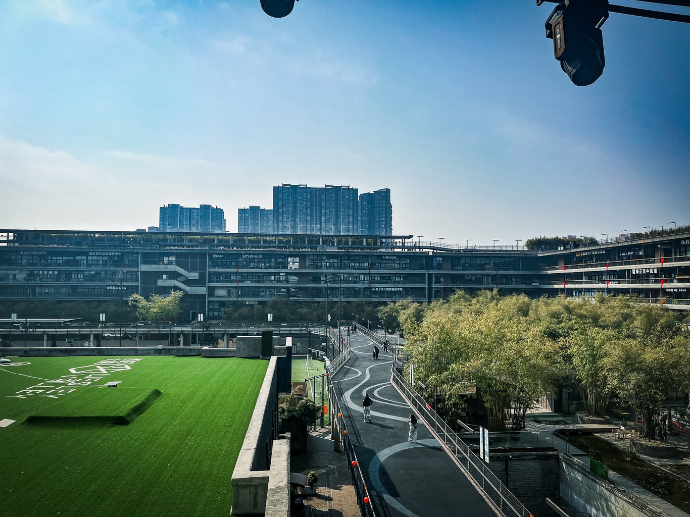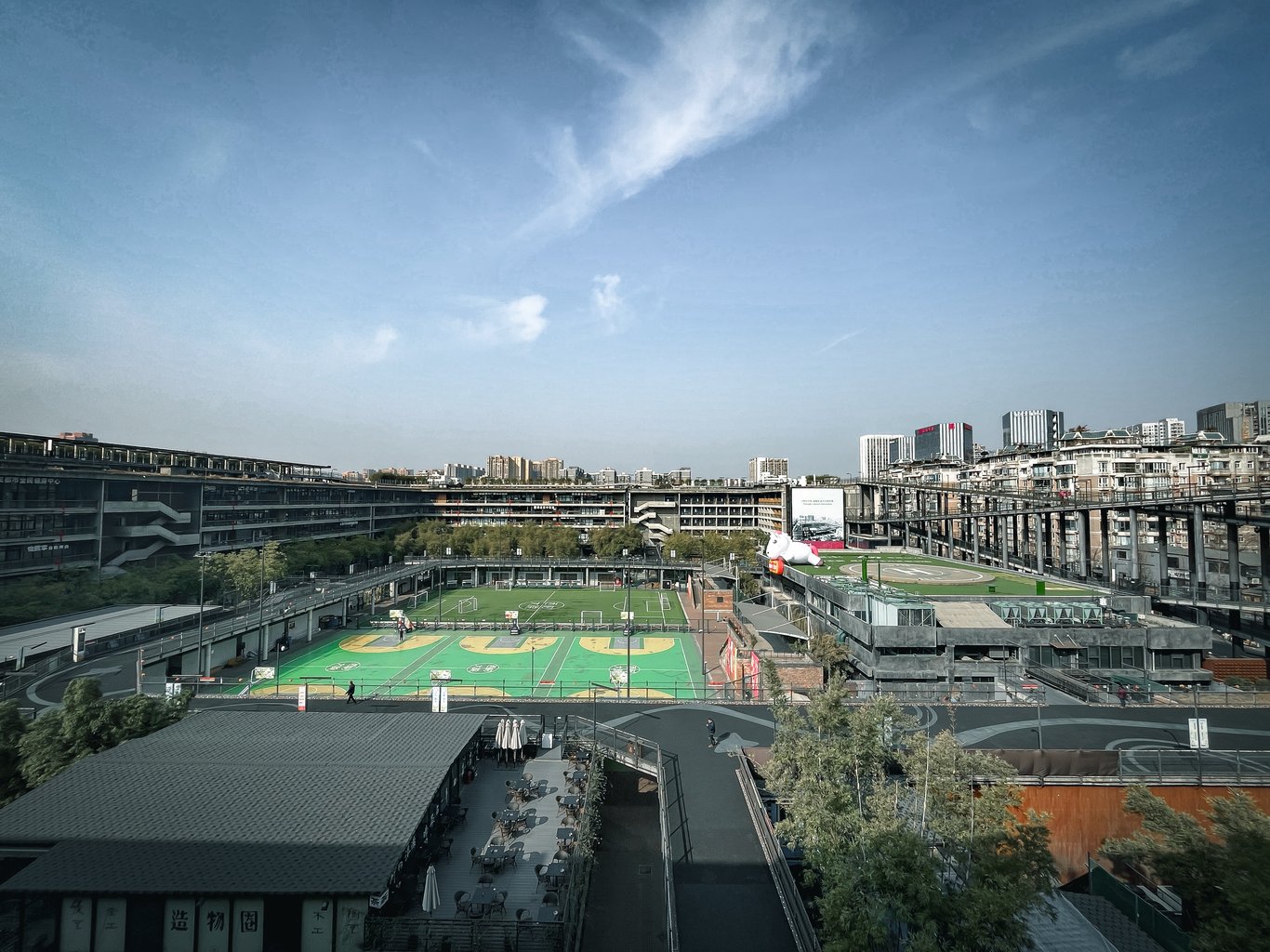 爬上五樓,西村大院的靈魂核心 —— 近40 畝全開放中央公共中庭一覽無遺,這也是這個建築物最具顛覆性設計、最能體現成都在地生活氣質的核心區域。中央運動中庭顛覆了常規的公共空間設計,畫面中最醒目的標準足球場與多片籃球場,是中國大陸商業建築中極為罕見的規劃邏輯 —— 建築師將地塊最核心、商業價值最高的區域,完全無償留給了市民公共活動,沒有修建任何商業建築。此外,這裡也是成都市全民健身中心官方認定的示範點位,足球場可靈活切換為 11 人制標準場地,配套專業夜場燈光,是成都城西知名的民間足球賽事舉辦地;籃球場免費對外開放,從早到晚都有本地居民在此運動,完美契合了成都「休閒運動、市井煙火」的城市氣質。