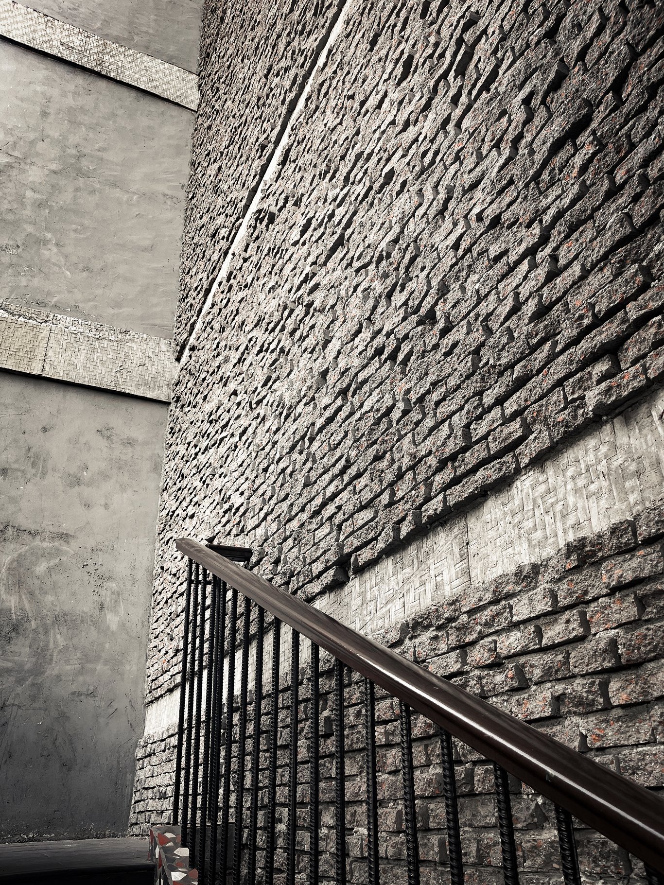 狹長的樓梯間,以一面粗獷的肌理牆,搭配另一面極簡的素水泥平牆,一繁一簡形成強烈的視覺對比,在狹小的垂直空間裡製造出飽滿的層次與張力;同時它不僅是連接各樓層的交通核,更是一個獨立的、有氛圍感的私密小空間,和項目整體「半開放半圍合」的院落邏輯一脈相承。
