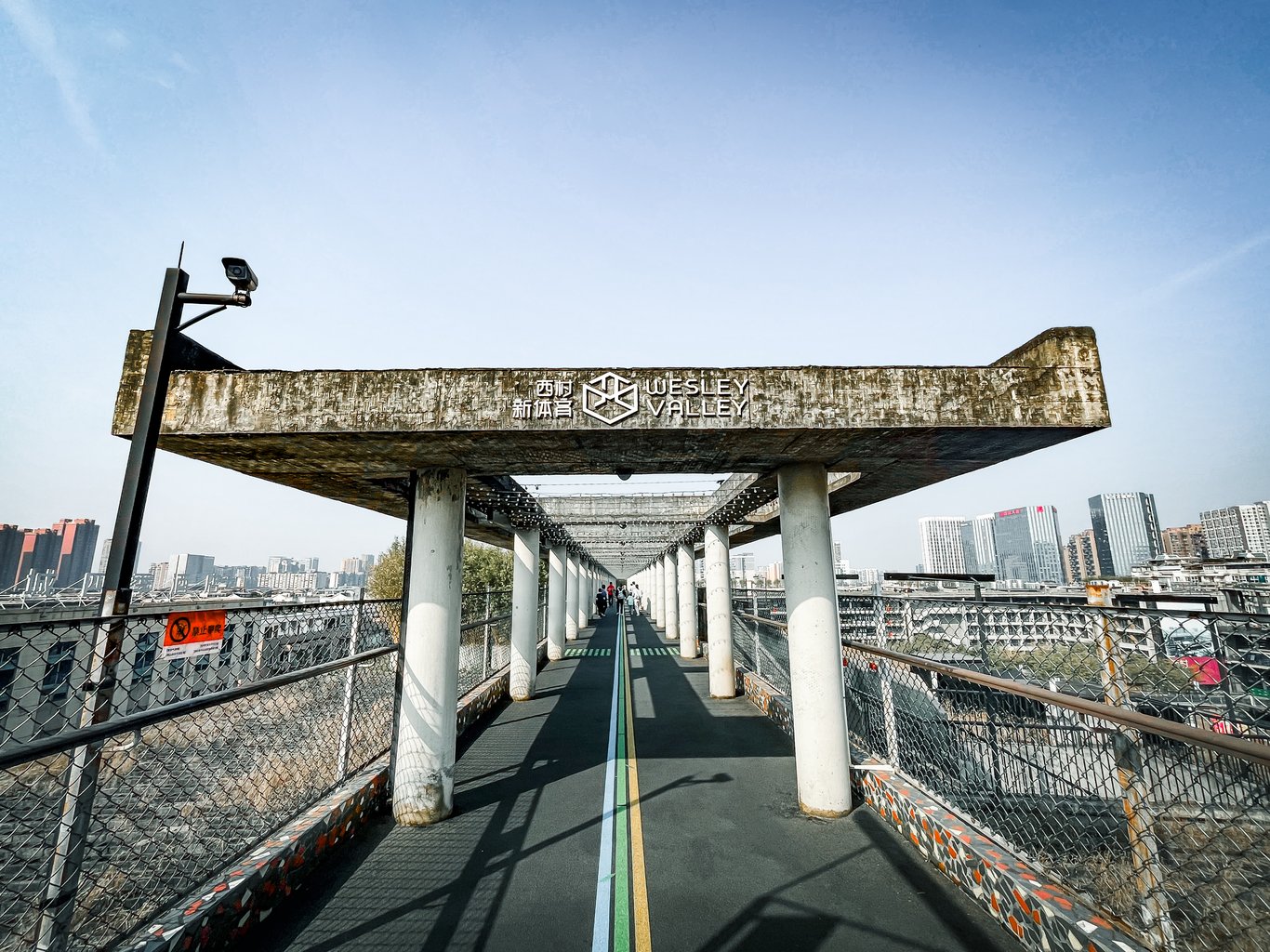 頂樓跑道一些地方佈滿燈串的金屬廊架,是這條跑道的氛圍靈魂。白天它是遮陽擋雨的半開放空間,夜晚燈串全亮後,這裡就變成了超具氛圍感的「星空光影隧道」,是西村大院夜景的核心打卡點,也是很多攝影愛好者拍攝燈光軌跡、氛圍感人像的絕佳場地。廊架頂部的「生活美學的創享者」字樣,也對應了西村大院「文藝生活複合社區」的核心定位。