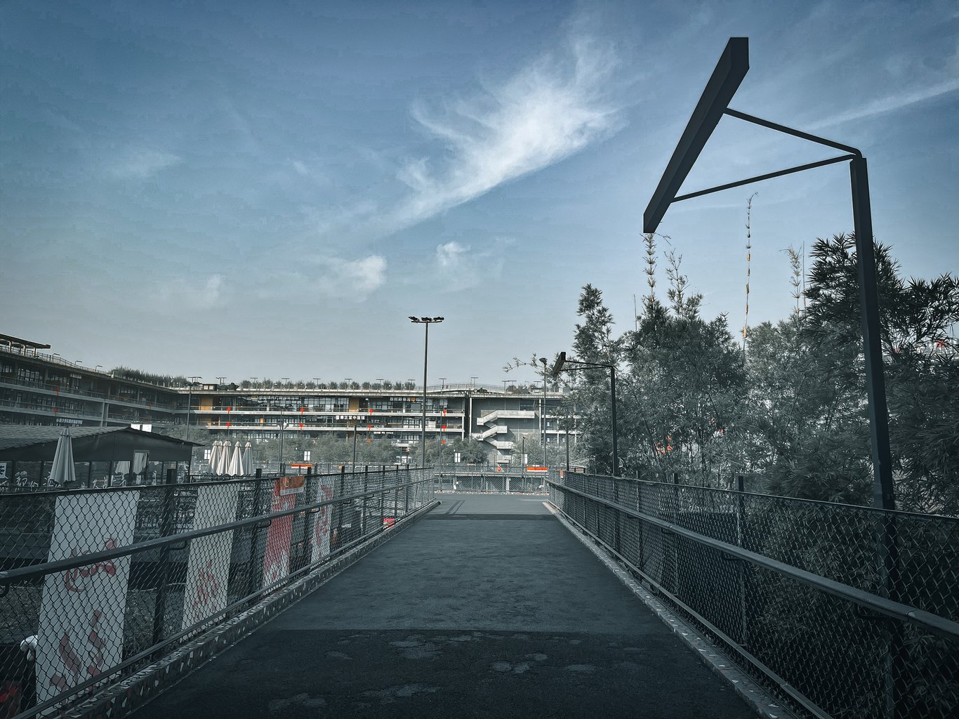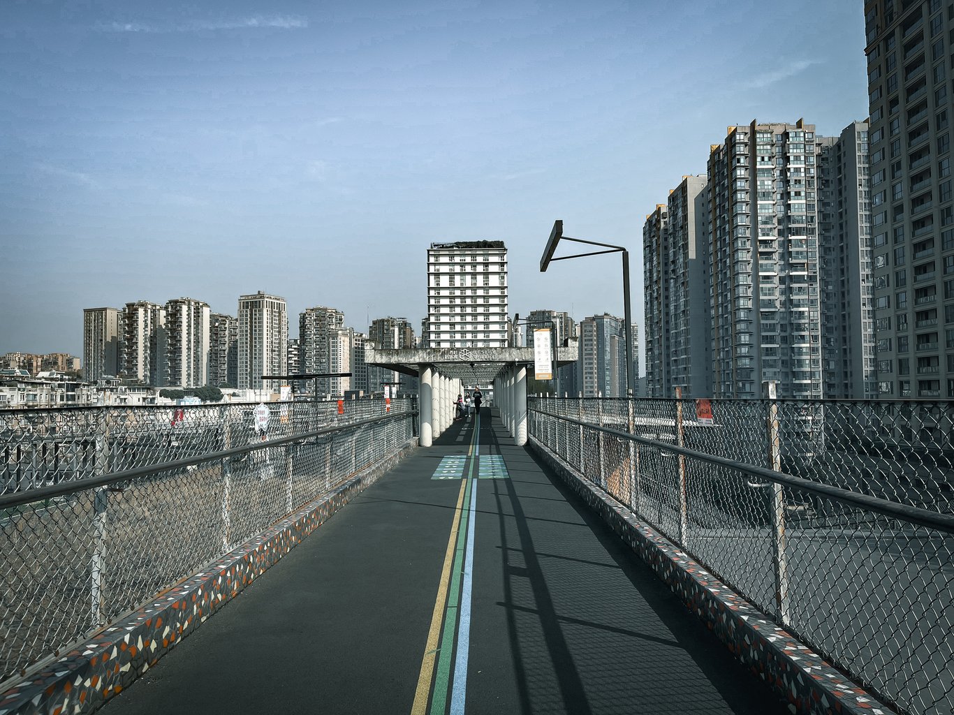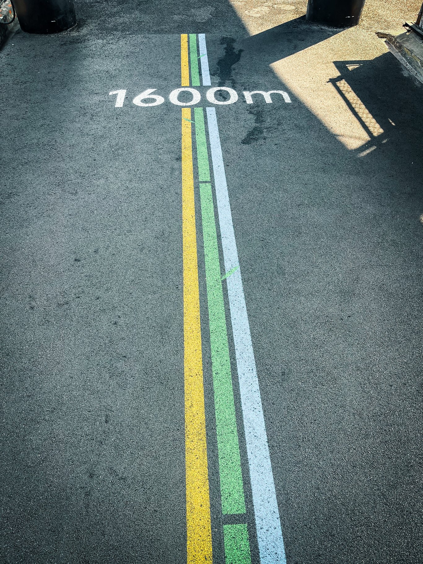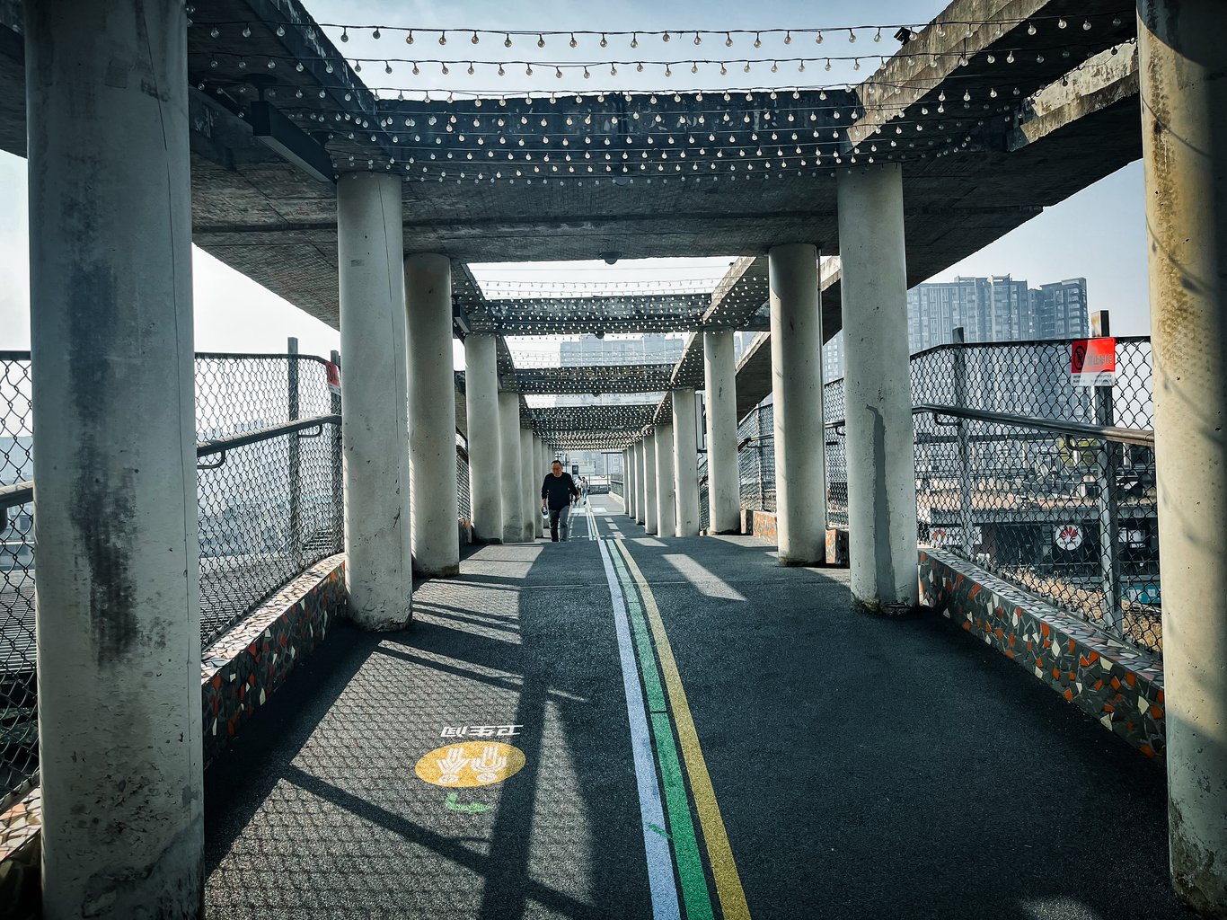 而成都西村大院 1.6 公里空中立體跑道的核心直道段,是整個跑道最具縱深感、最出圈的象徵性打卡點,也是整個項目「公共空間優先」設計理念的核心載體。腳下的這條黑色路面,是中國大陸首個非體育場館類的城市空中環形跑道,全程採用專業運動場地標準的防滑彈性塑膠材質兼顧腳感與安全性。路面中間的藍、綠、黃三色標線,不僅是視覺亮點,更承擔了功能分流的作用:中間區域為專用跑步道,兩側為步行遊覽道,同時地面標註了公里數刻度,方便跑步者把控運動距離,兼顧了專業運動屬性與市民遊覽需求。