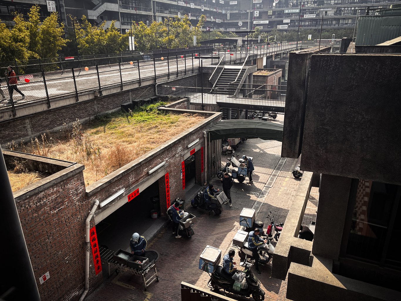 由於西村大院的地下一樓有盒馬鮮生這間阿里巴巴集團旗下販賣生鮮食品子公司,因此這個區域是建築師專門規劃的後勤專屬動線,與遊客的步行遊覽動線、機動車行駛動線完全物理隔離。畫面中的快遞、外賣配送車輛,可直接從項目外圍的專用入口抵達這裡,無需經過中庭、空中跑道等遊客核心區域;同時配套專用樓梯與貨梯,可直接將貨物運送至樓上的商鋪、工作室與居住空間,既保障了整個大院數百家商戶的日常經營與後勤補給,又完全不會干擾遊客的遊覽體驗,是中國大陸商業項目中極為少見的超前人性化設計。