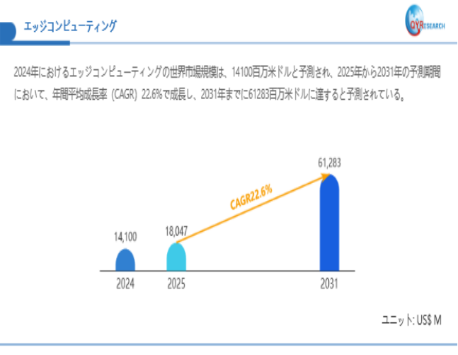 QYResearchが最新発表した「エッジコンピューティング―グローバル市場シェアとランキング、全体の売上と需要予測、2026~2032」市場調査報告書によると、世界エッジコンピューティング市場規模は2024年の約14100百万米ドルから2025年には18047百万米ドルへ着実に成長し、予測期間中に22.6%の複合年間成長率(CAGR)で拡大を続け、2031年には61283百万米ドルに達する見込みである。