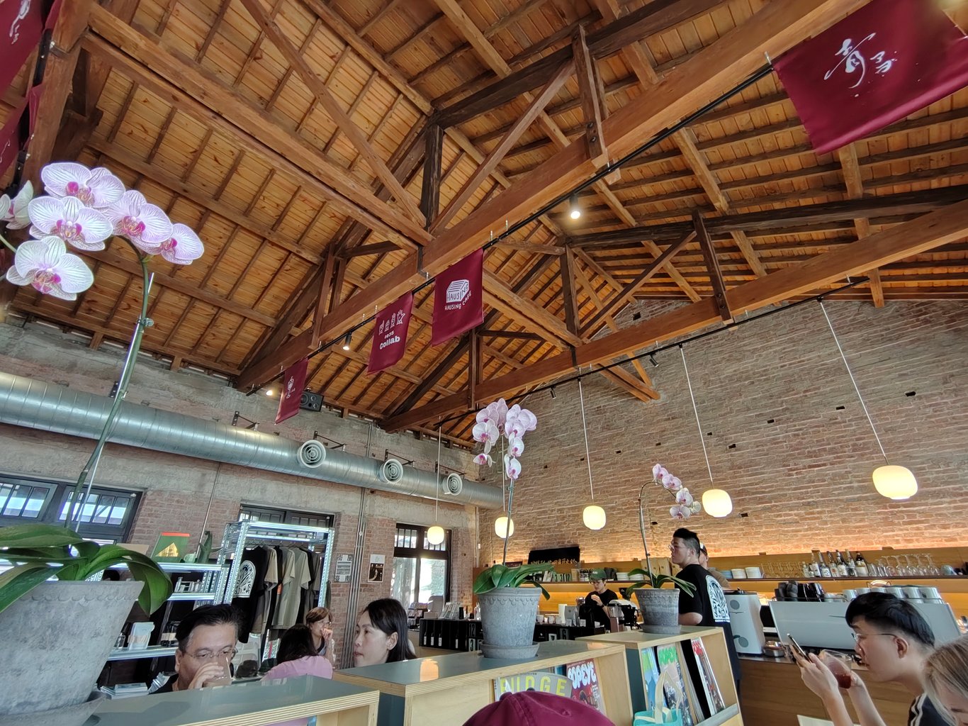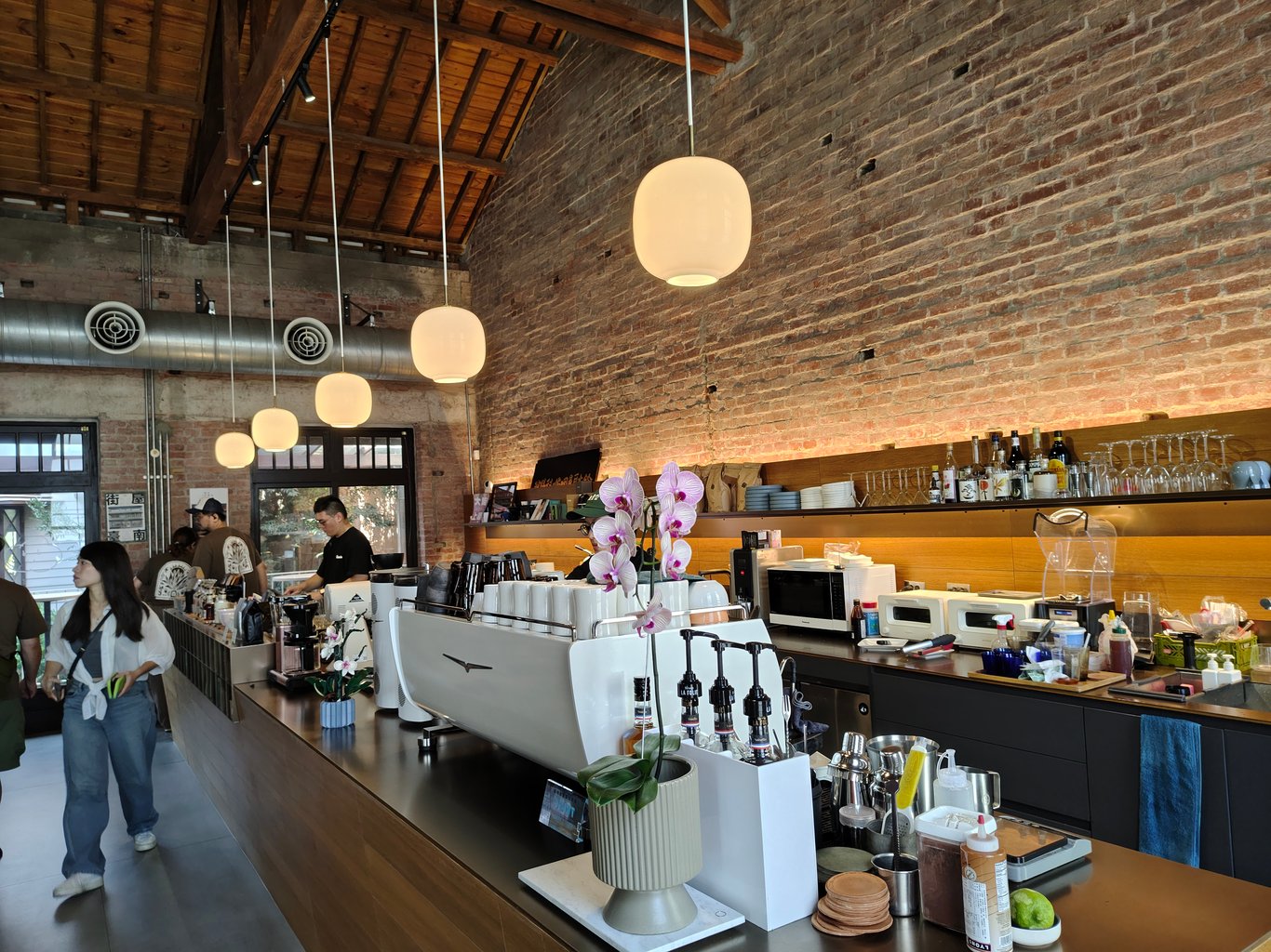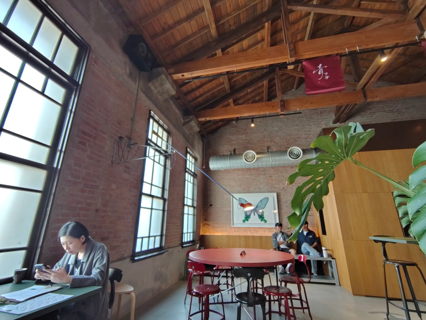 沿著左側樓梯上二樓,就會到內用區。沿用建築的挑高設計並保留木桁架與大片紅磚牆面,搭配工業風的燈具與管線設計,與地板、木質家具等不同材質互相襯托出空間的層次感,達到新舊融合的平衡感。引入自然日光的廊道陽台,則讓空間的採光及通透感更上一個層次。