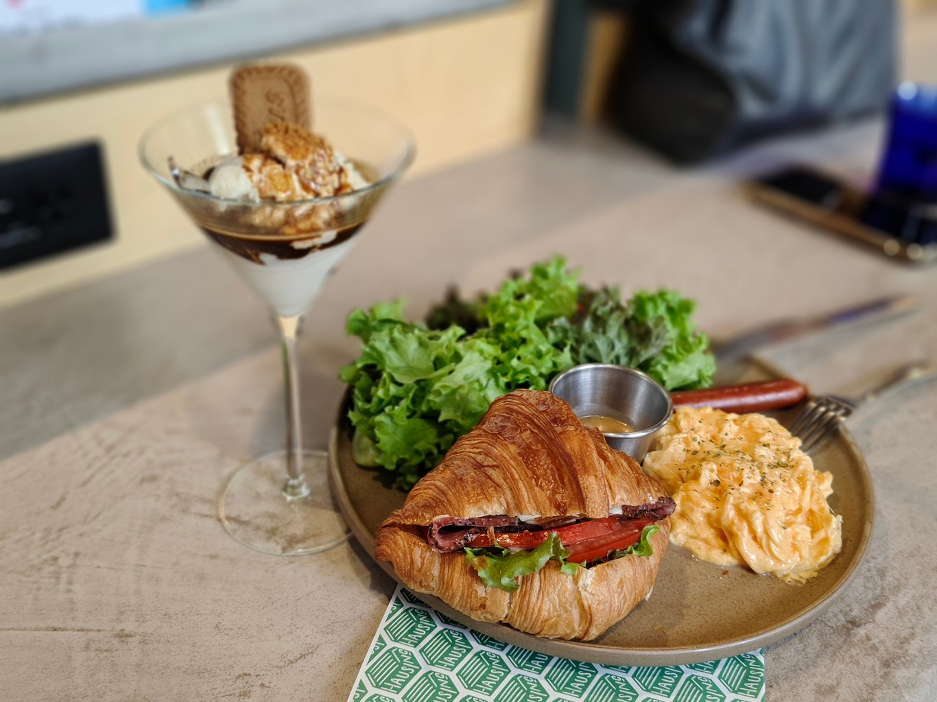 我們點了一份牛肉可頌早午餐,自許 Affogato 達人的我則是不例外地又點了一杯。他們的可頌香脆清爽、牛肉軟嫩夠味之外,炒蛋的調味非常到位,不像一般有些標榜健康的餐廳,炒得濕度過重又沒味道,德式香腸的腸衣脆口彈牙,搭配以沾了胡麻醬的生菜,整體的味覺與口感既平衡又飽滿,我們都瞬間覺得一吃就整個開胃了。若適時再配上一口 Affogato 的冰淇淋,那甜鹹鄉間,冷熱交錯的滋味,更是完美的組合~
