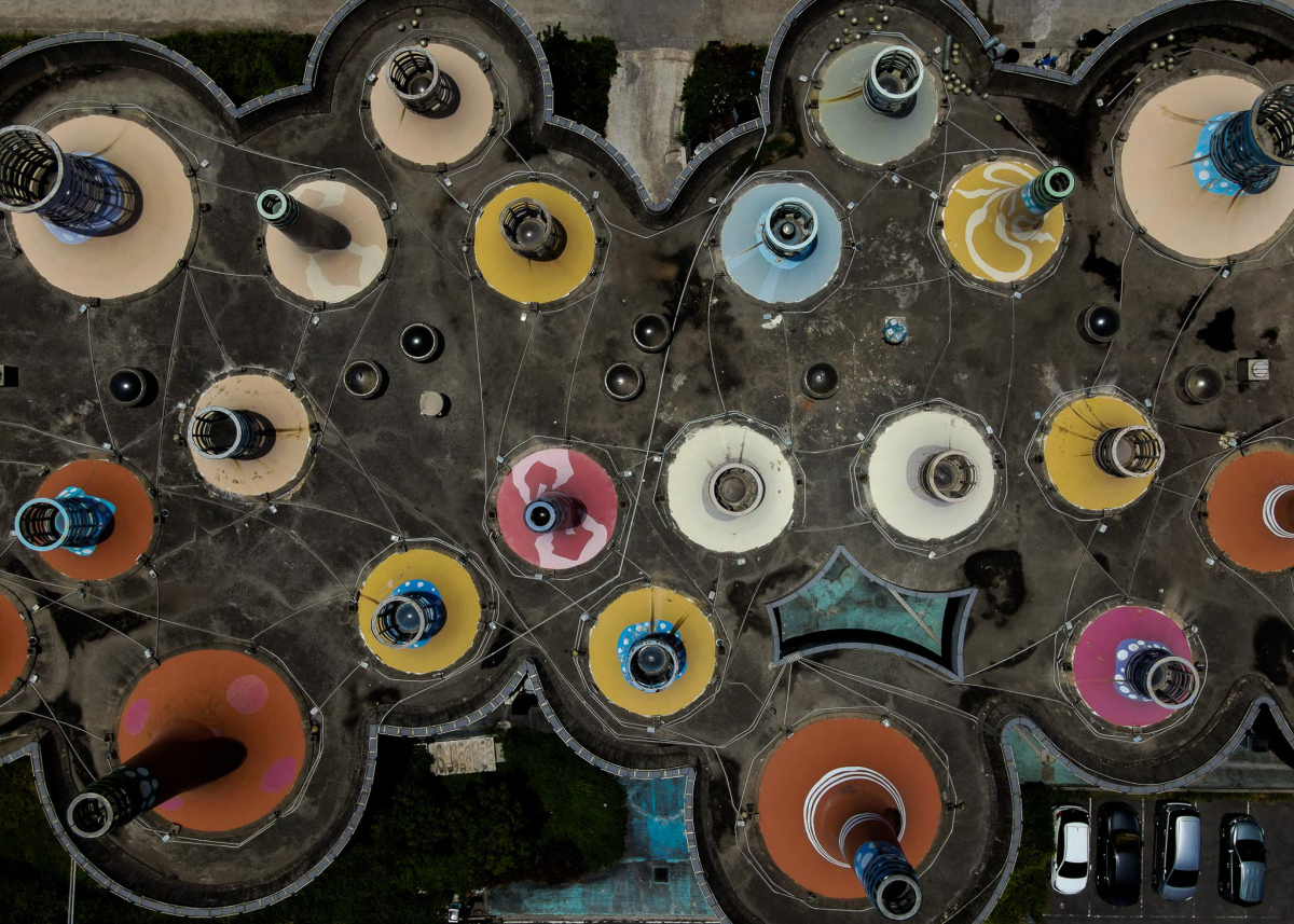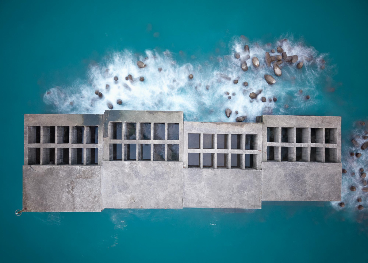 例如,書中收錄了位於新北市萬里區、造型如不明飛行物的「飛碟屋」廢墟,這些源自1980年代的建築,在垂直視角下展現出奇異的末世美感。又如屏東外海排列整齊、直徑超過50公尺的箱網養殖場,在湛藍海面上猶如漂浮的星球,精準地勾勒出工業、經濟活動與自然生態交融的奇特圖景。