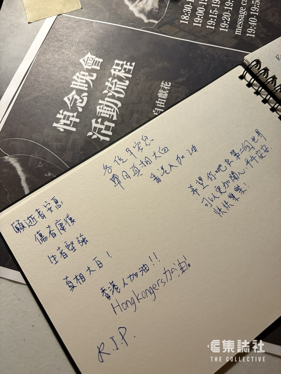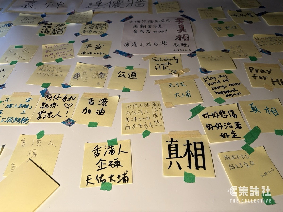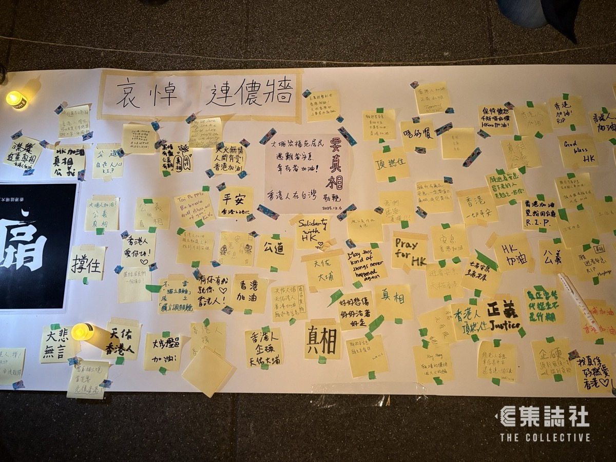 造成 159 人死亡大埔宏福苑的大火,牽動海外港人的心,在台港人籌組的「香港宏福苑火災台灣悼念關注組」,發起在周六晚(6日)於台北自由廣場外,為火災死難者悼念的活動,超過 300 出席者,除透過默哀和獻花,向遇難者致哀,也有人留言給災民作鼓勵,並在地上用出席者所摺的紙鶴,砌出「HK」字樣。悼念的人群中,有曾是宏福苑老街坊符生和符太,也有火災遇難者的朋友、在大埔成長的港人,以及帶著悲憤到場香港人,他們希望透過悼念,表達心繫香港。