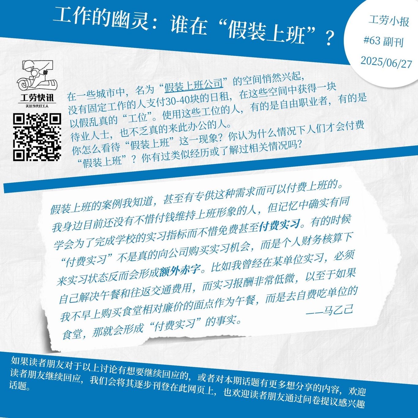 以上是第63期工劳小报副刊的全部内容。我们正在探索将日常的工人资讯定期整理为 Newsletter,希望你可以来信(laboreditor251@proto...)提出建议或加入成为志愿者,同时也请你多多分享给墙内的朋友们。点击下方按钮可以订阅和阅读往期内容。