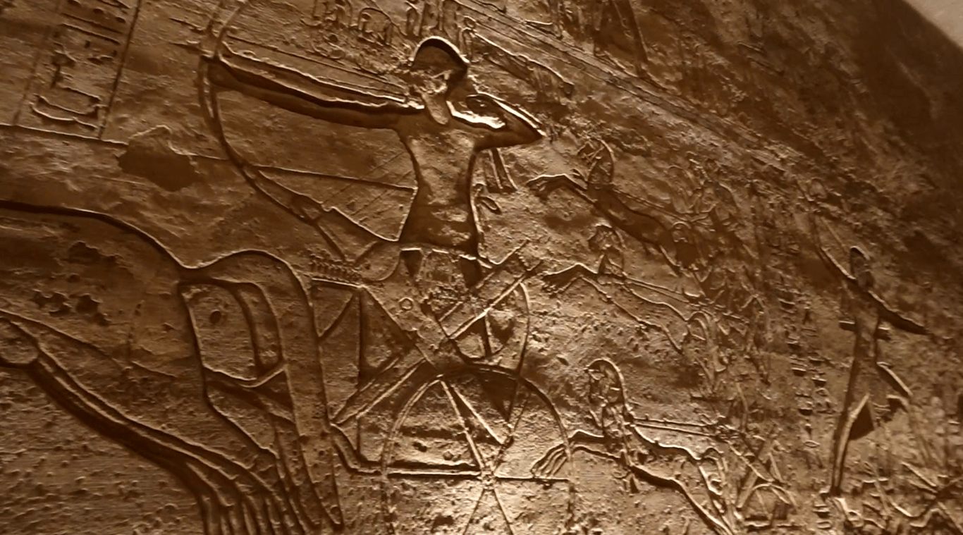 拉美西斯二世在阿布辛貝、路克索、卡納克、阿拜多斯、拉美西斯神殿,幾乎每一座他蓋過的牆上,都刻了同一個版本的故事:法老親自上陣,半神半人地擊退赫梯大軍,數千輛敵軍戰車在他一人面前潰敗。