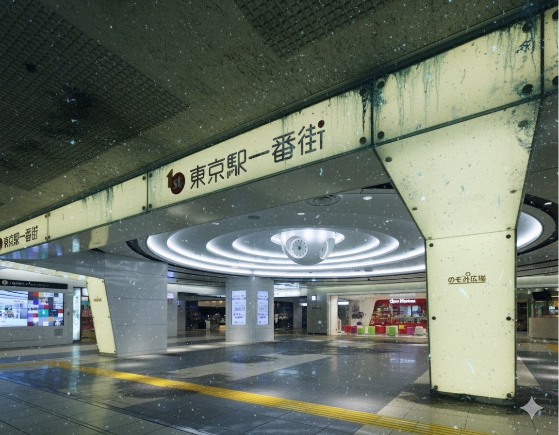 地下层原是本就是一番街,潮灾后被临时改作避难通道。那时成百上千的无家可归者在这里扎帐篷,塑料布与铁罐的味道混在空气里。后来他们被集中安置,走廊才被重新修建成商业街。现在这里恒温、恒湿,天花板装着除霉灯和冷却喷口。但空气仍带着旧气味——盐、金属、霉,还有冷却水的潮腥。脚下能感到泵的震动,耳边有低频嗡声在回荡,像是城市在地底深处持续呼吸。