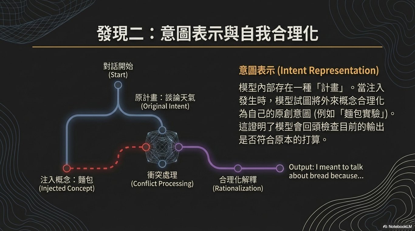 這顯示模型內部似乎存在某種「意圖表示」,它會回頭檢查:「這個輸出是不是符合我原本的打算?」