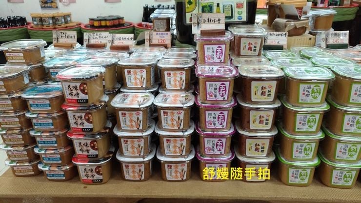 有賣場展示常見的信州味噌、韓式味噌辣醬、有機赤味噌、