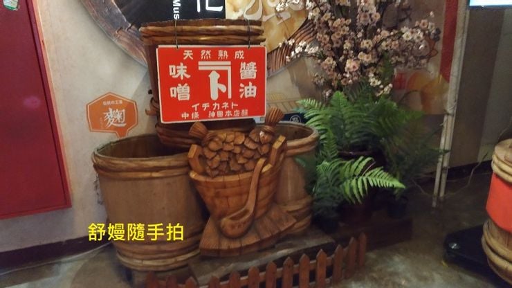 杉木味噌花木桶旁有路標指示,右轉上二樓。