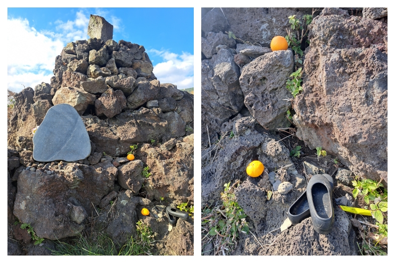路的盡頭有一個石頭堆砌起來的尖錐物,石頭與石頭縫隙間,擺放著黑色膠鞋,鞋旁則有參觀者擺置的花朵與柑橘。我以為這就是多朗休洞窟,才正要走過去,許湖峻卻比著對面那不起眼小土堆說:「這就是多朗休洞窟。當年我就是從這邊下去。」