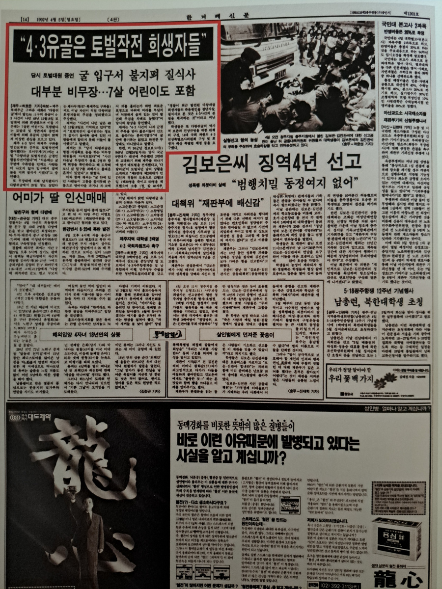自1992年4⽉1⽇起,藏在濟州島⽉朗峰「多朗休洞窟」中的11具遺骨,透過媒體報導出現在世⼈眼前。圖為當年4月5日於《韓民族日報》刊載的系列報導之一,為許湖峻所寫。1989年成立的濟州4.3研究所成員憑藉著蔡姓長輩的口述,花了兩、三年時間,於1991年12月22日,在一片雜草中找到這個洞窟。他們沿著洞口往下走了3公尺後,看到整整齊齊排在洞穴中的骸骨,有的繫著腰帶,血肉腐爛,有的腳邊散落著女用塑膠鞋,還有一些腐爛衣物的殘片。