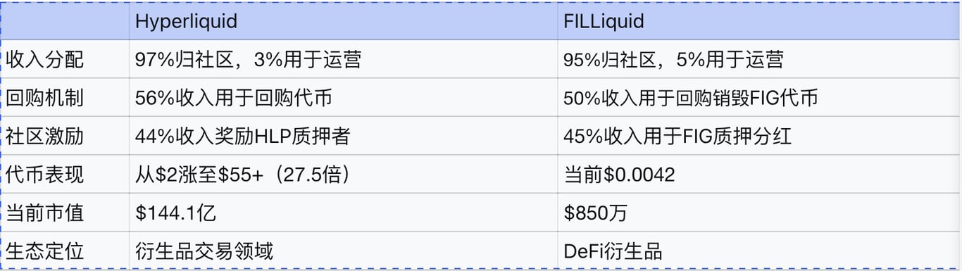 两者共同点:都强调通过高比例收入回购/回馈用户来提升代币价值;差异点在于业务定位——Hyperliquid 主攻衍生品,FILLiquid 侧重 Filecoin 存储生态。