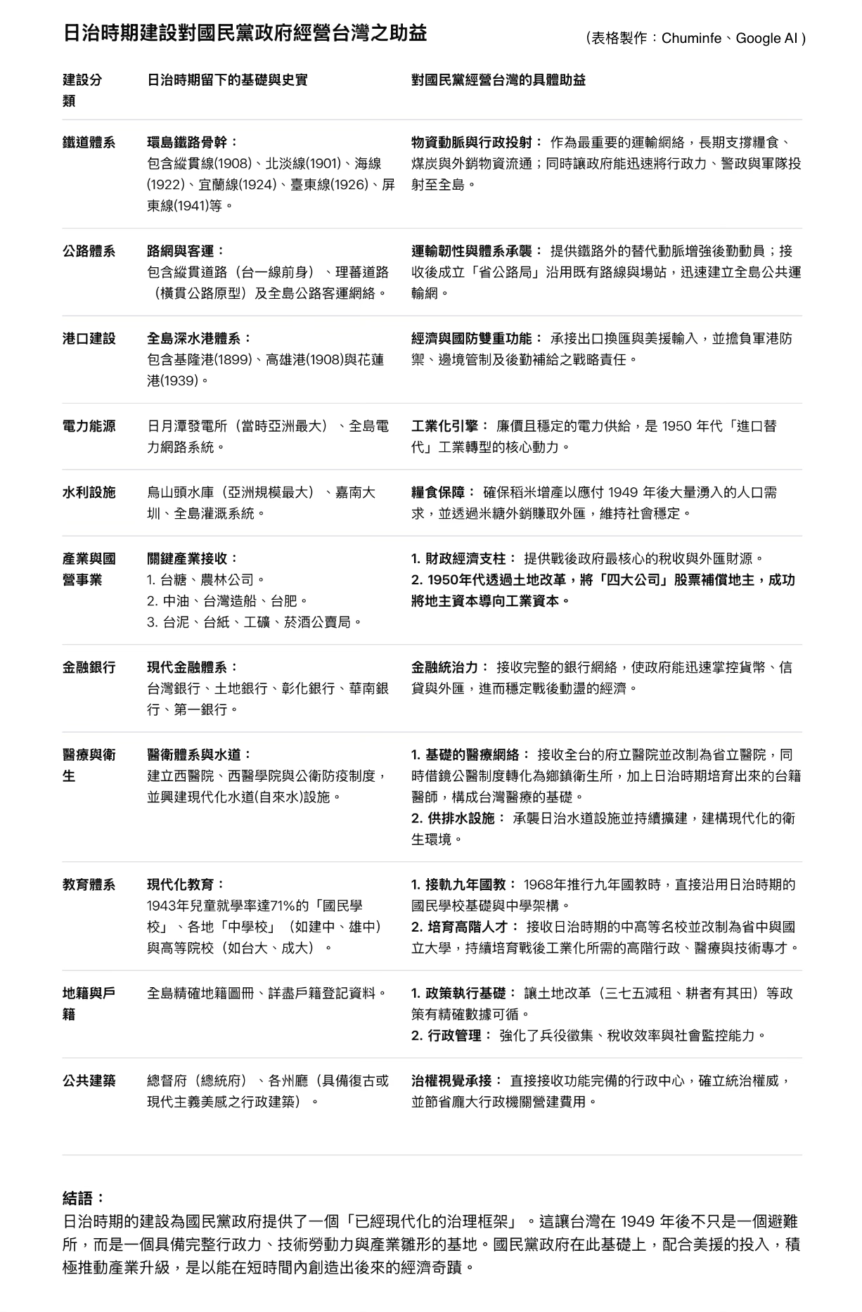 ⭐️ 註三:日治時期留下的建設對國民黨政府的助益