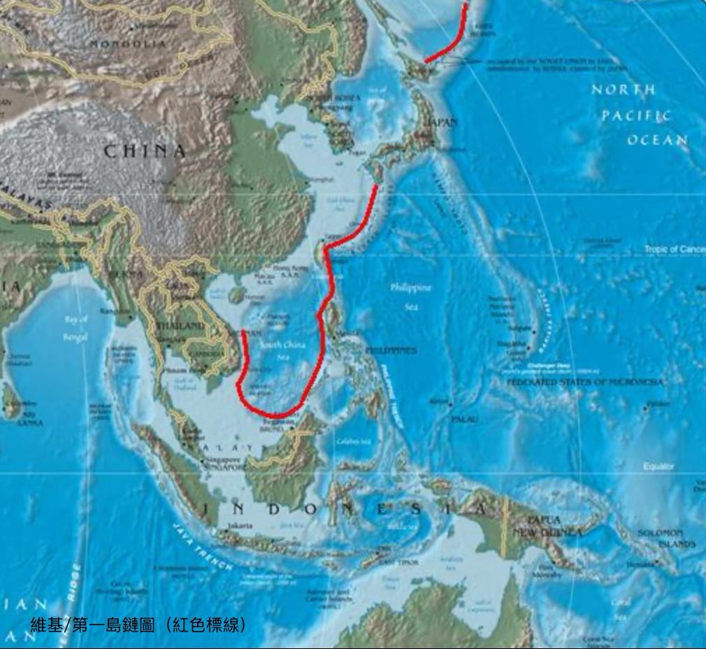 註:「第一島鏈」被定義為一條北起千島群島,向南延伸至馬來半島的連續弧線。其核心地理構成包括: