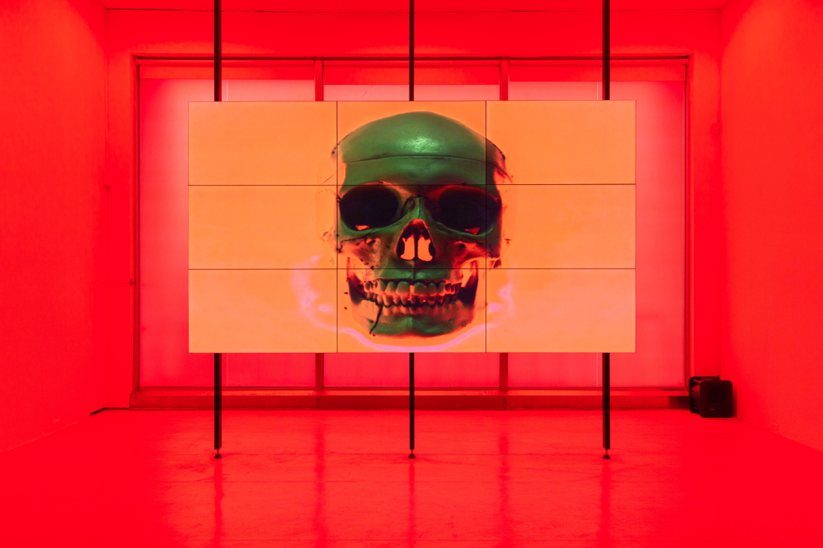 例如皮・斯塔弗(P. Staff)的《骸骨》(Skeleton , 2025),「透過拍攝人類骨骼,探討身分認同、記憶與我們對身體的認知。」藝術家更透過多螢幕動態影像,與展場光線及噪音聲響,挑戰人骨殘骸在展示技術變化的過程中,可能衍伸出的意像扭曲與變異。