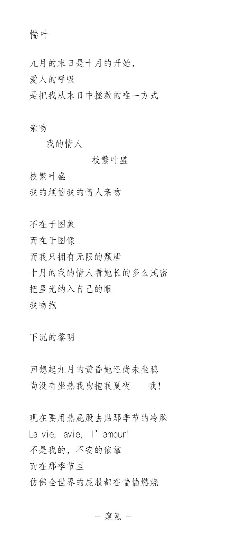 七日書|曖昧時刻 · 第七天《惴叶》窥氪chiuenhong·7 小时前·IPFS暧昧是惴惴不安 诗歌CC BY-NC-ND 4.0 授权建议频道选择希望推荐到的频道(单选)生活事书音影旅・居性别/爱创作・小说时事・趋势身心灵没有适合的频道不参与频道推荐 (文章将出现在「还有」中)下一步喜欢我的作品吗?别忘了给予支持与赞赏,让我知道在创作的路上有你陪伴,一起延续这份热忱!支持作者支持作者2窥氪chiuenhong18岁,马来西亚青年诗人,作品发表于星洲日报、南洋商报,以及新加坡雨林诗刊。 来自作者相关推荐《哦,海鸥!》《秋水记》《丢手绢》22