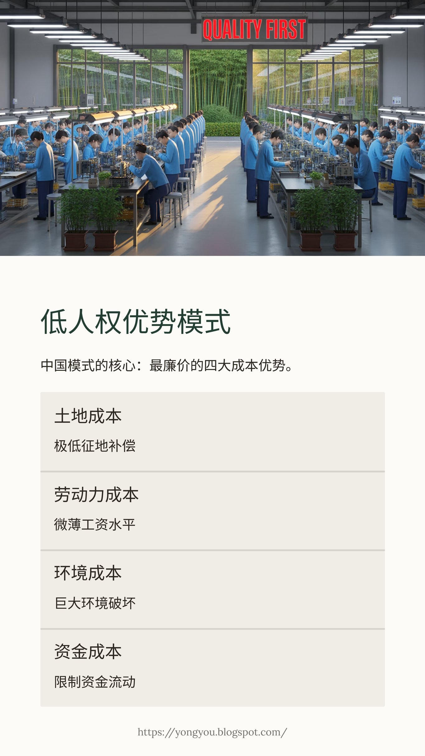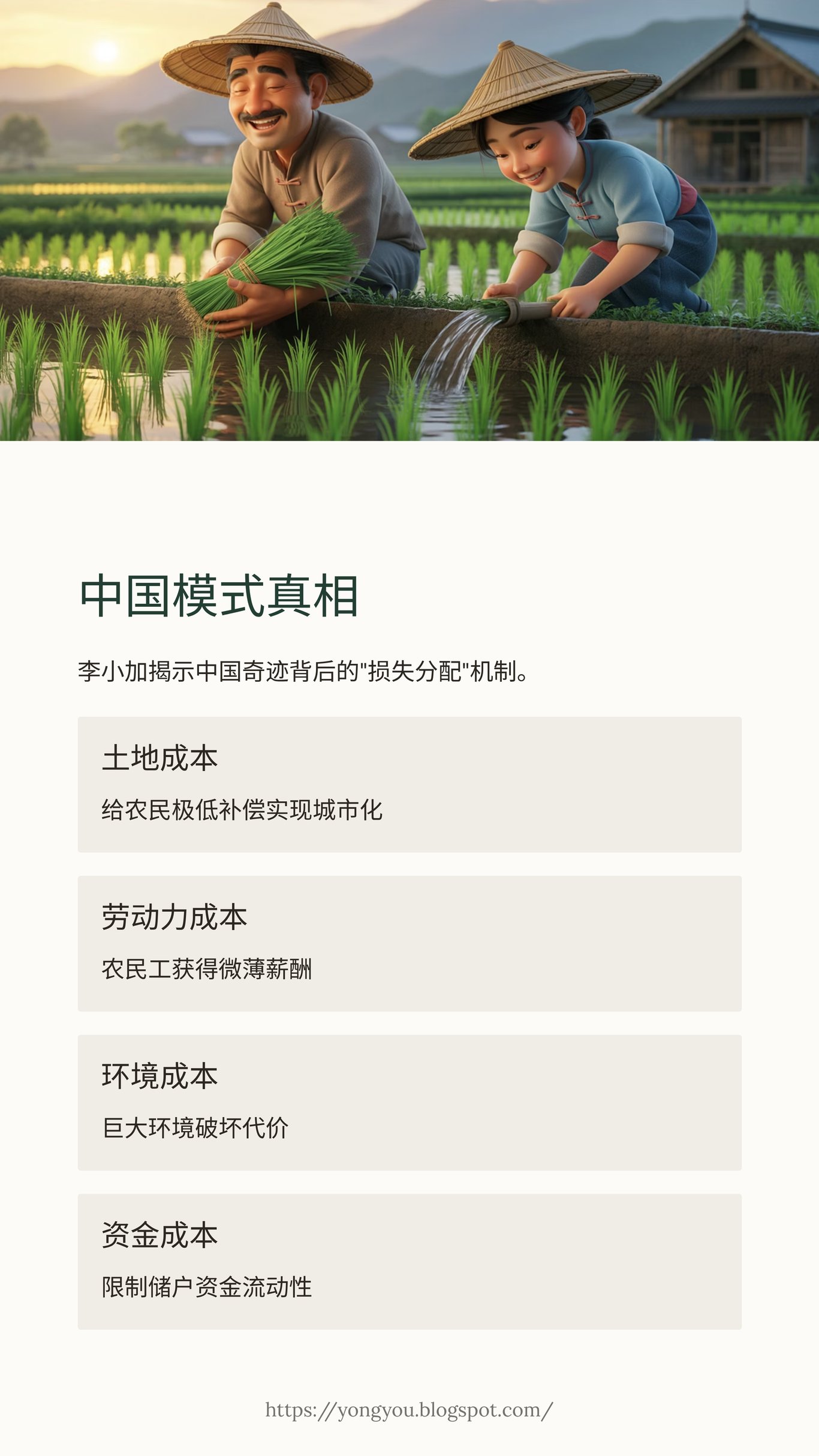 四重成本的损失分配:土地(低补偿的城市化)、劳动力(低工资的工业化)、环境(外部性未计价)、储户(金融压抑下的资金成本)。