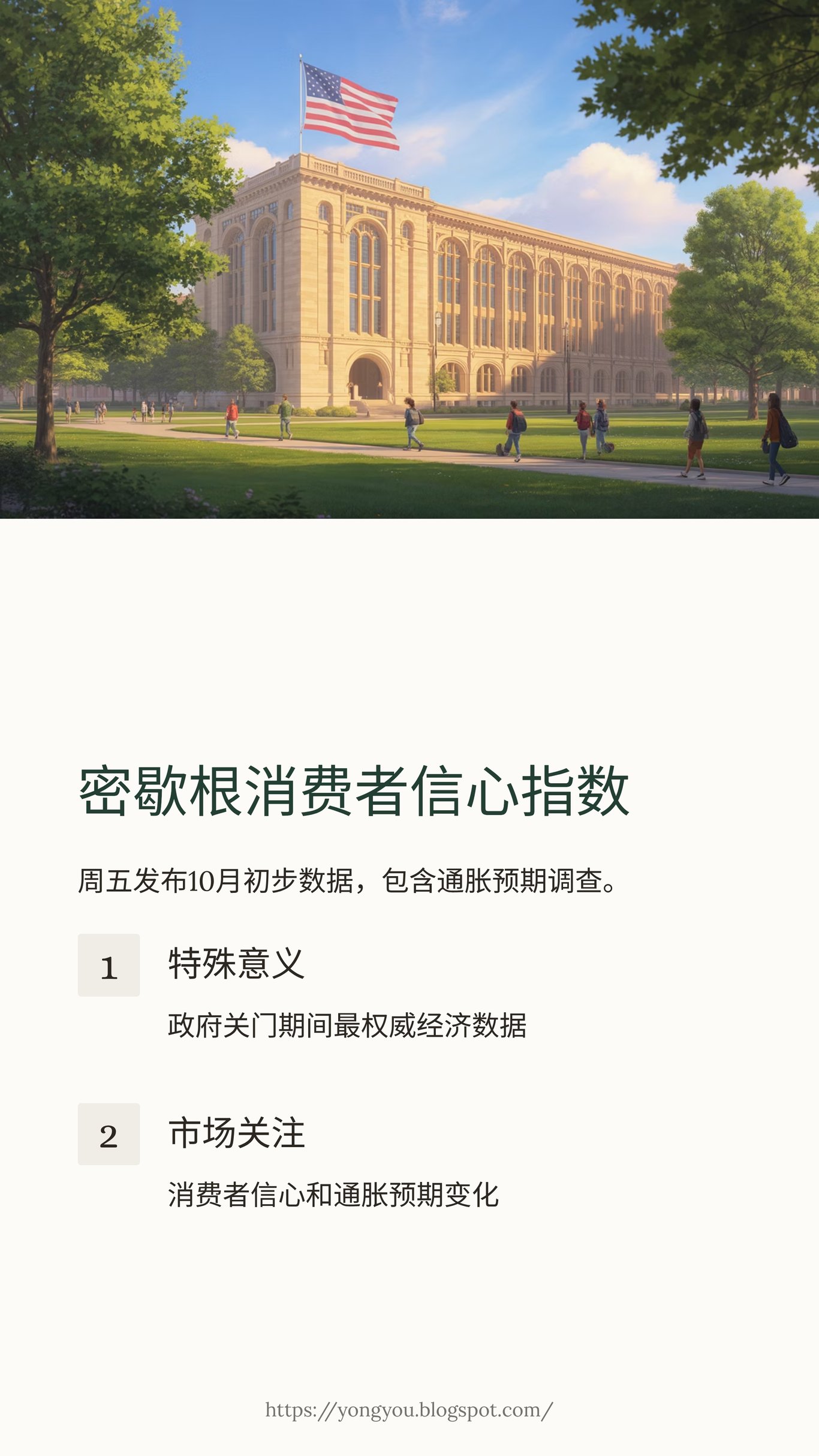 在美国政府关门导致官方宏观数据可能延迟的背景下,密歇根读数临时“抬升为”本周最权威的高频信号,尤其是1年期与5–10年期通胀预期。其边际变化将被市场放大解读:若长期通胀预期上翘,将弱化市场对近端降息的押注;反之,则增强“软着陆”叙事的可信度。