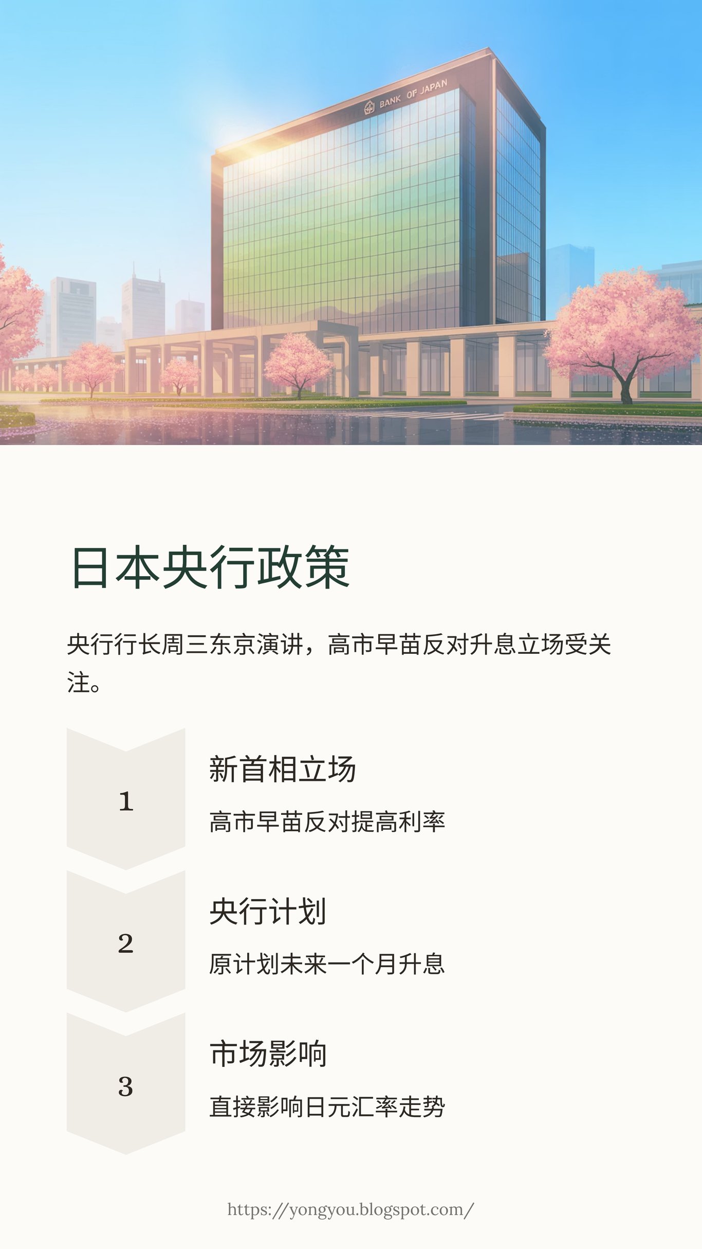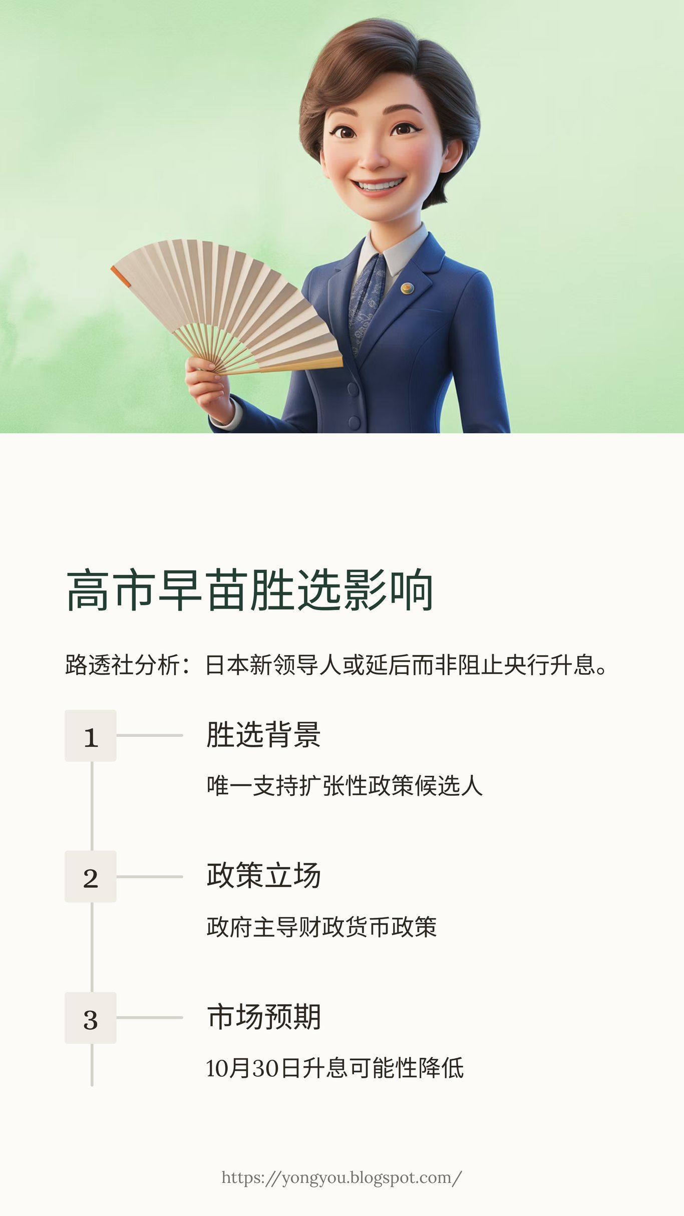 政治变量的进入使得原先的“渐进式退出YCC”和“极慢节奏加息预期”出现不确定性。新首相高市早苗以扩张性政策与宽松取向见长,短期上可能压低“10月加息”的概率,但若日元贬值压力再起,明年初的政策微调窗口仍在。演讲若释放对工资—物价良性循环的自信,将强化“慢退出、看汇率”的路径依赖。