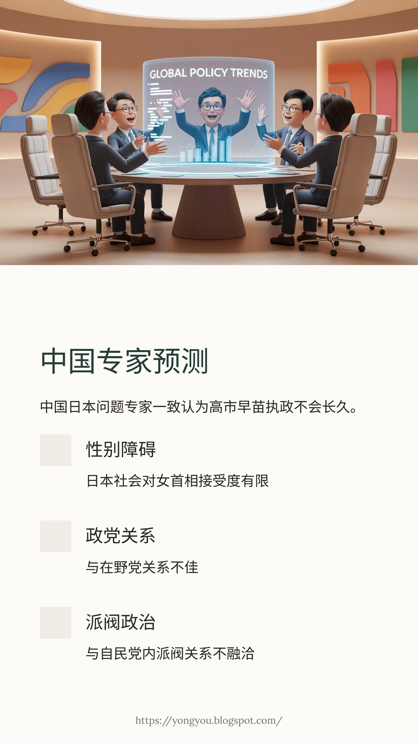 中国学界与舆论对高市存在明显逆风评价:从“性别政治的社会接受度”、到“在野党协同与党内派阀关系”、再到“缺乏重量级内阁履历”的质疑,甚至判断其任期“较短”。从政策跟踪角度,更重要的是把握“人事布局—预算编制—对外安全—产业补贴”的联动节奏,以此观察其“政策可达性”。