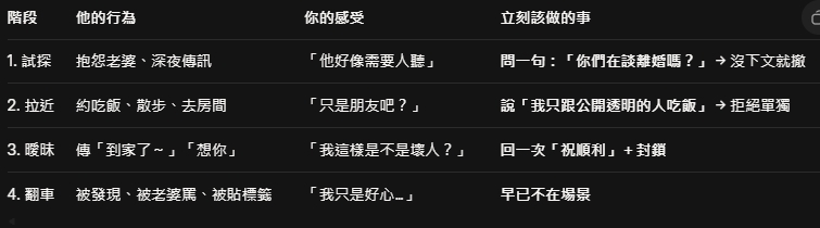 記住:感情不好,從來不是「可以出軌」的通行證,而是「該離婚」的警鈴。敢偷吃、不敢離婚的男人,本質就是:貪心+膽小+不負責。