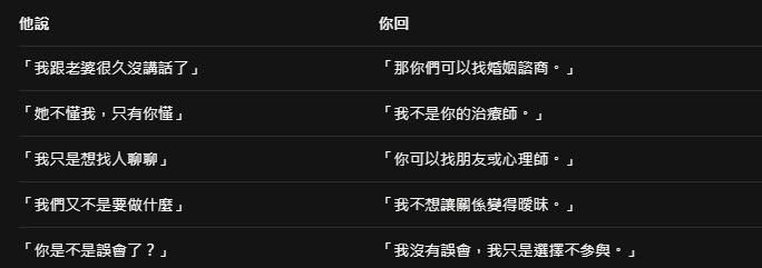 女人不是「婚姻不好」的修補站。他敢說「我跟老婆不好」,你就敢回: